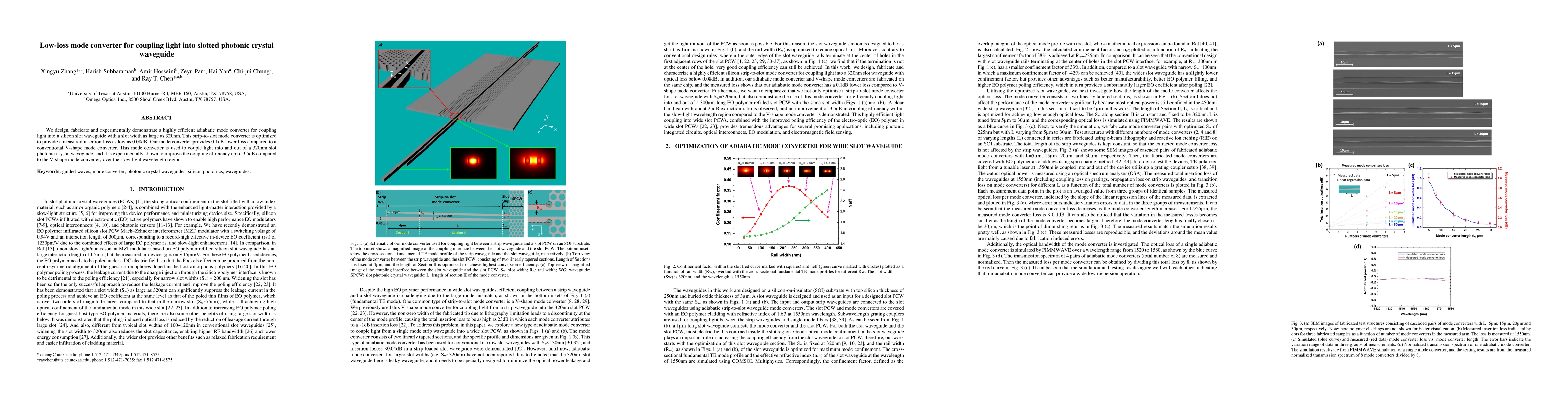 This paper presents a highly efficient adiabatic mode converter for coupling light into a silicon slot waveguide with a large slot width of 320nm, achieving a low insertion loss of 0.08dB and improving coupling efficiency by up to 3.5dB compared to conventional V-shape converters.
