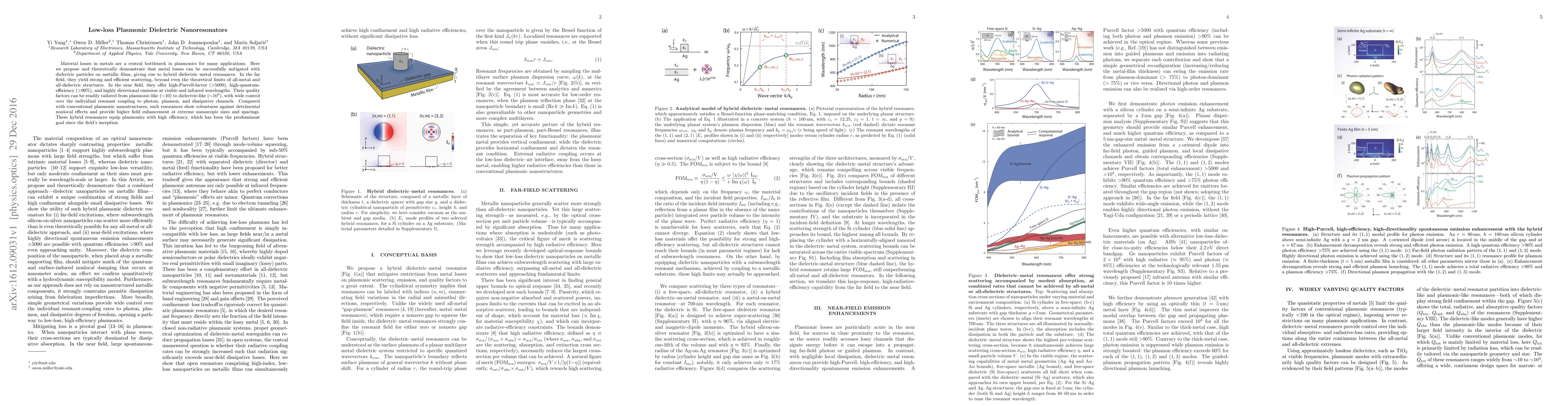 This paper proposes dielectric particles on metallic films to mitigate metal losses in plasmonics, creating hybrid dielectric-metal resonances that achieve strong scattering, high-Purcell-factor, and high-quantum-efficiency, while offering tunable quality factors and robustness against nonlocal effects.
