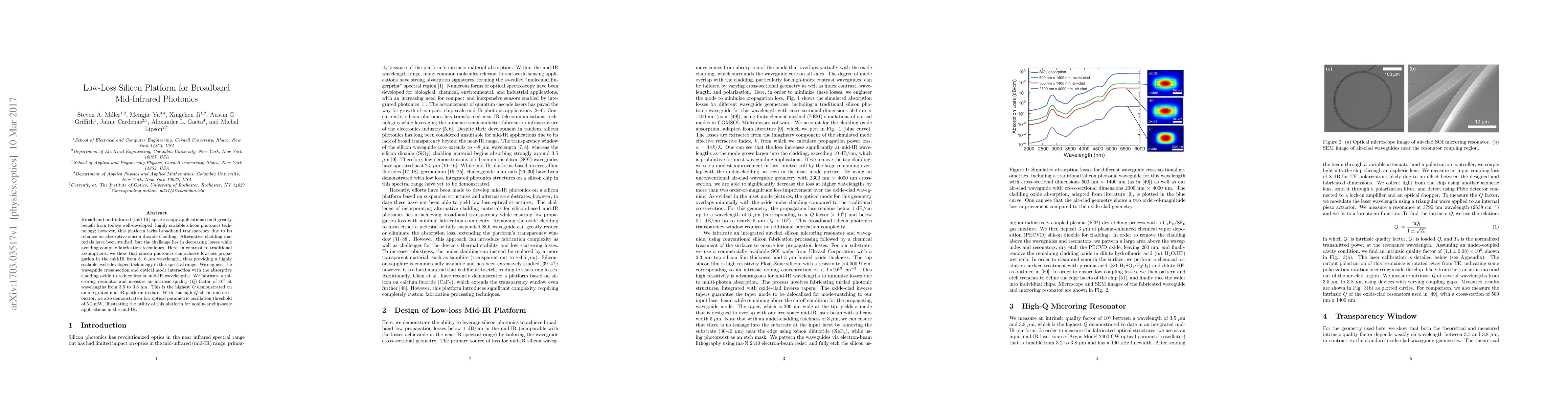 This paper demonstrates a low-loss silicon photonic platform for broadband mid-infrared (mid-IR) photonics, achieving intrinsic Q factors of 10^6 in microring resonators, and a low optical parametric oscillation threshold of 5.2 mW, highlighting its potential for scalable mid-IR applications.