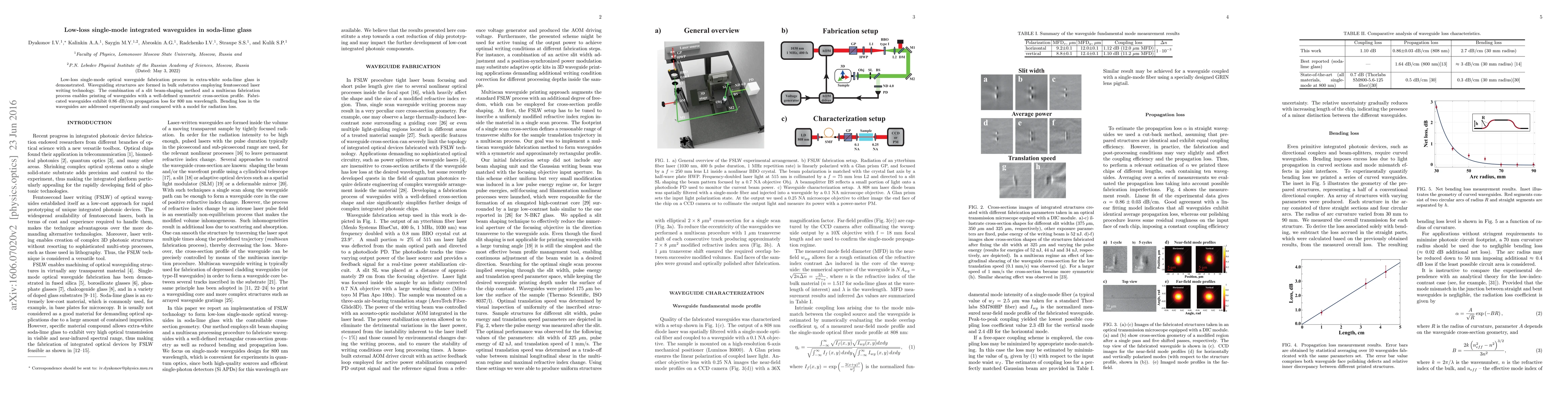 This paper demonstrates the fabrication of low-loss single-mode optical waveguides in extra-white soda-lime glass using femtosecond laser writing, achieving 0.86 dB/cm propagation loss at 800 nm. The study also investigates bending loss and compares experimental results with a radiation loss model.