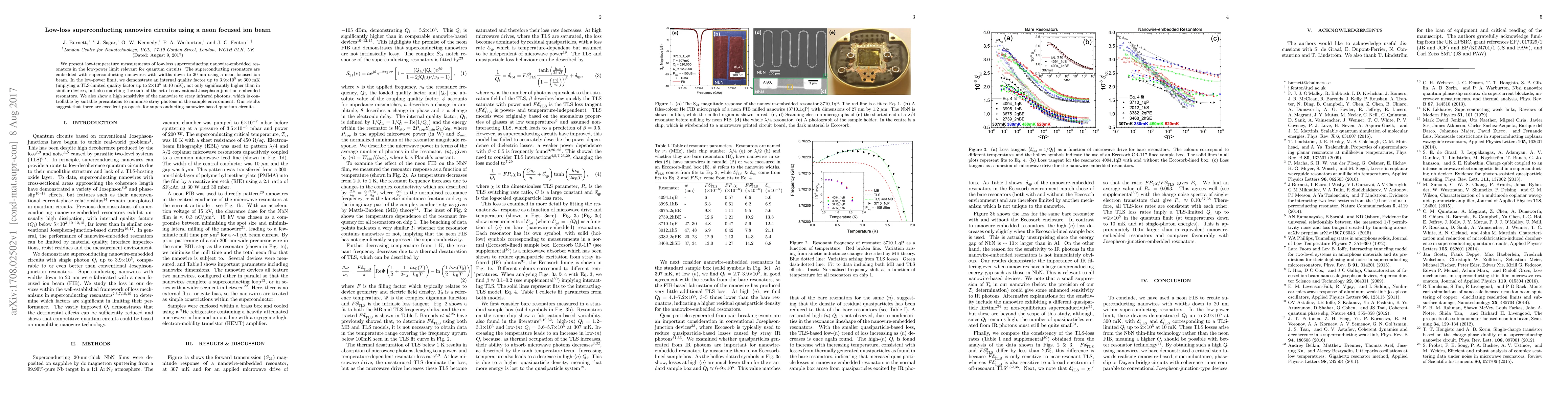 This paper reports on the development of low-loss superconducting nanowire circuits using a neon focused ion beam, achieving an internal quality factor of up to 3.9x10^5 at 300mK, demonstrating superior performance compared to similar devices and matching the best conventional Josephson-junction-based resonators. The study also highlights the sensitivity of the nanowires to stray infrared photons, which can be mitigated for optimal performance.