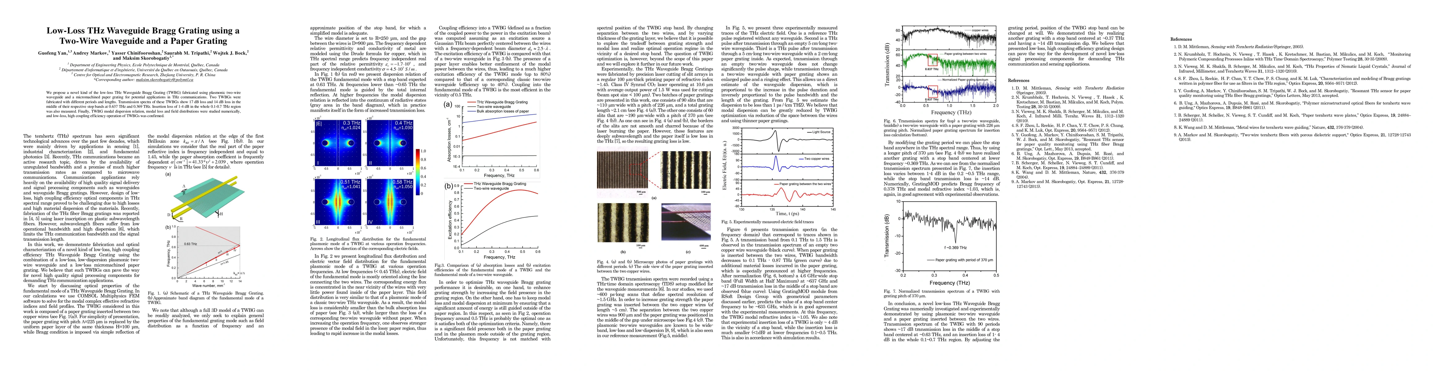 This paper proposes a low-loss THz Waveguide Bragg Grating (TWBG) using a plasmonic two-wire waveguide and a micromachined paper grating, achieving 1-4 dB insertion loss across 0.1-0.7 THz. Numerical studies confirm high coupling efficiency and low modal dispersion.