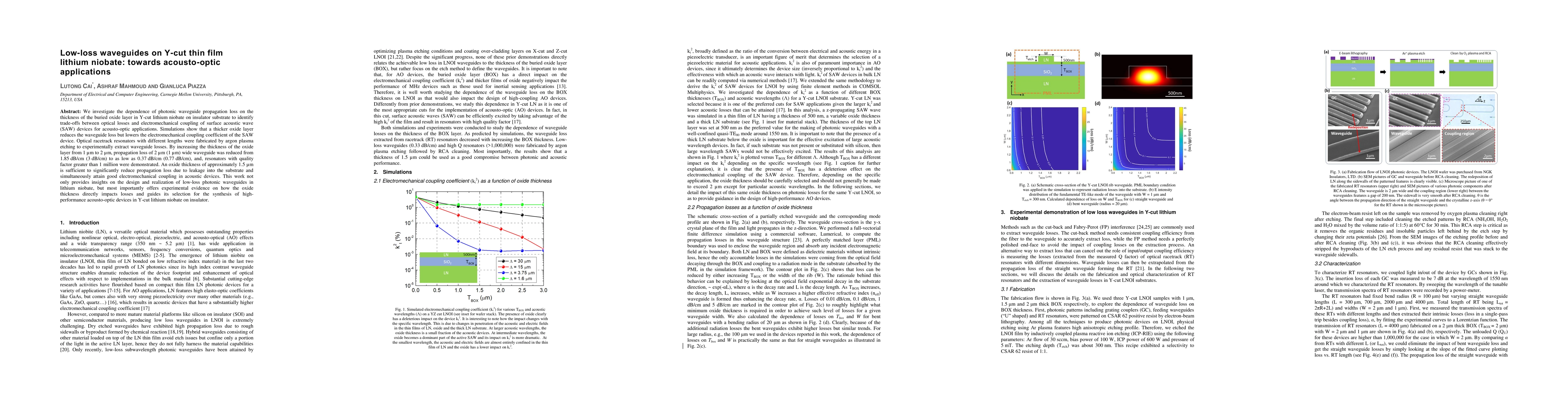 This research explores how varying the thickness of the buried oxide layer in Y-cut lithium niobate affects photonic waveguide loss and electromechanical coupling for acousto-optic applications. Experimental results show that a thicker oxide layer reduces waveguide loss but lowers acoustic device coupling, highlighting an optimal thickness of approximately 1.5 μm for minimal loss and good coupling.