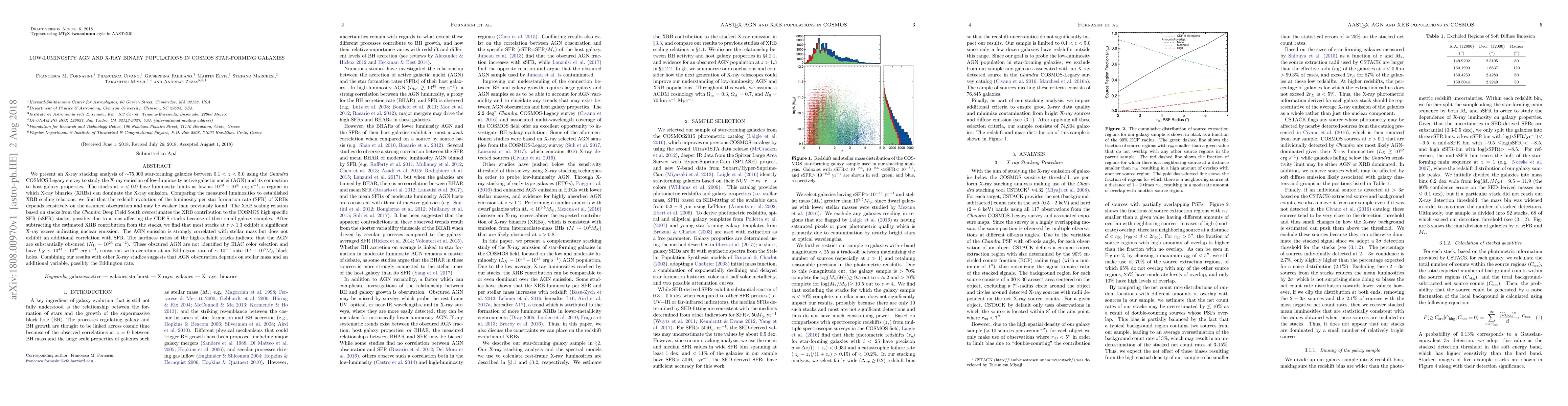 This study uses X-ray stacking analysis of 75,000 star-forming galaxies to investigate low-luminosity AGN and X-ray binaries in COSMOS. It finds that X-ray binaries dominate at low luminosities and that AGN emission correlates strongly with stellar mass but not with star formation rate, indicating substantial obscuration.