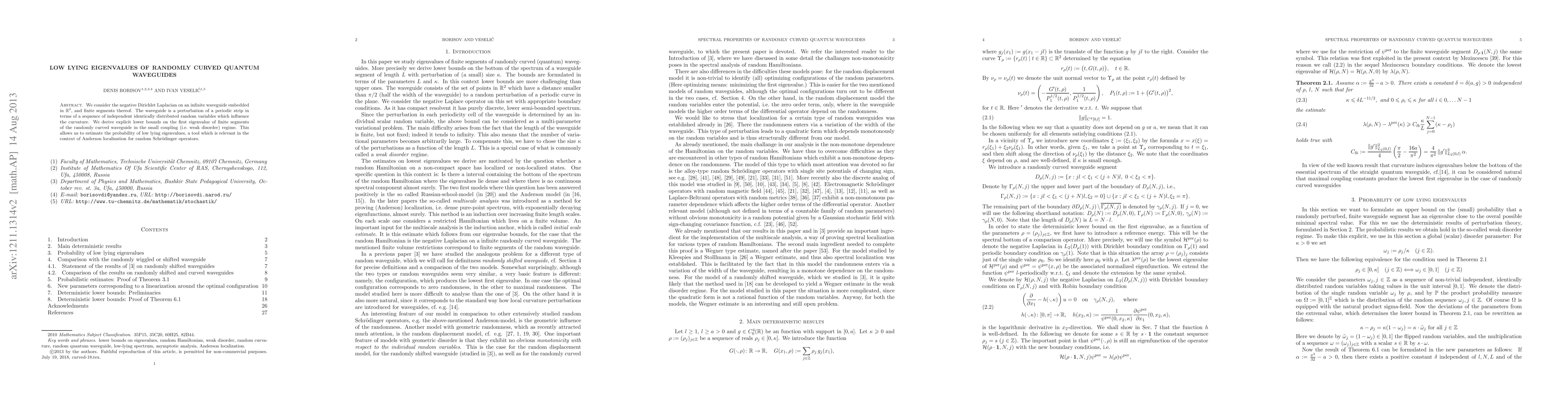 We consider the negative Dirichlet Laplacian on an infinite waveguide embedded in $\RR^2$, and finite segments thereof. The waveguide is a perturbation of a periodic strip in terms of a sequence of independent identically distributed random variables which influence the curvature. We derive explicit lower bounds on the first eigenvalue of finite segments of the randomly curved waveguide in the small coupling (i.e. weak disorder) regime. This allows us to estimate the probability of low lying eigenvalues, a tool which is relevant in the context of Anderson localization for random Schr\"odinger operators.