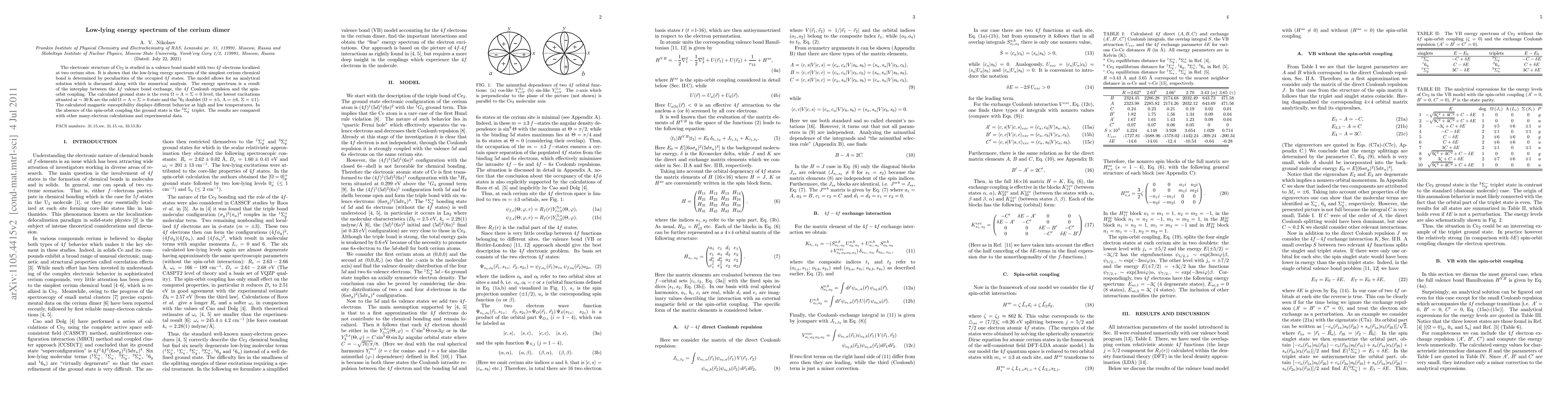 This study investigates the electronic structure of Ce₂ using a valence bond model, revealing that the low-lying energy spectrum is shaped by the unique characteristics of the occupied 4f states. The analytical model highlights the interplay between 4f valence bond exchange, 4f Coulomb repulsion, and spin-orbit coupling, predicting a ground state at even \Omega=\Lambda=\Sigma=0 and low-temperature excitations.