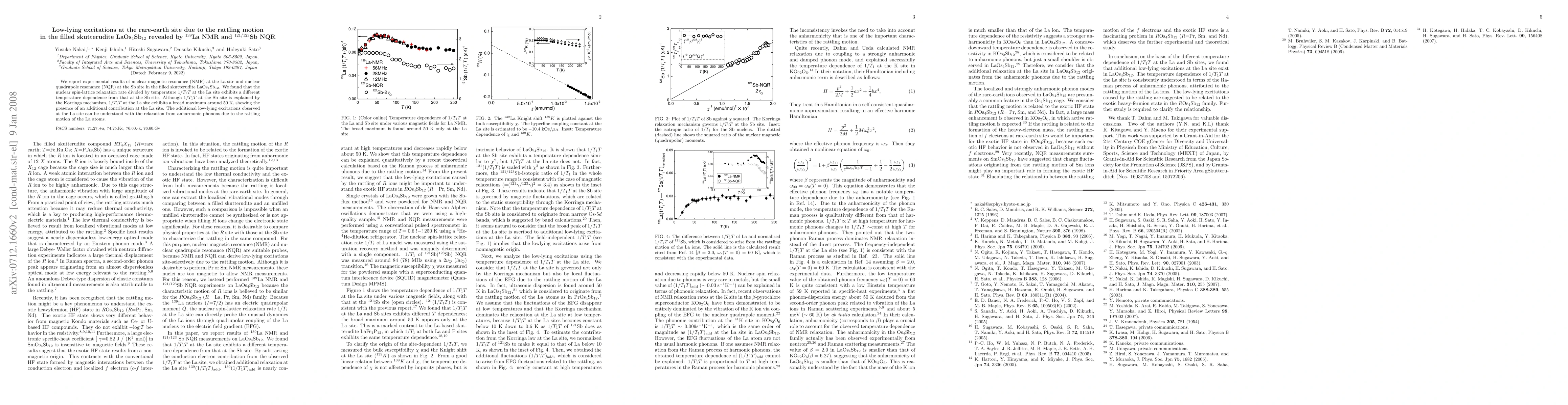 This paper explores low-lying excitations in LaOs$_4$Sb$_{12}$ using $^{139}$La NMR and $^{121/123}$Sb NQR, revealing that the La site exhibits a broad maximum in $1/T_1T$ due to rattling motion, while the Sb site follows the Korringa mechanism. The findings highlight the impact of phonon anharmonicity on nuclear relaxation rates.