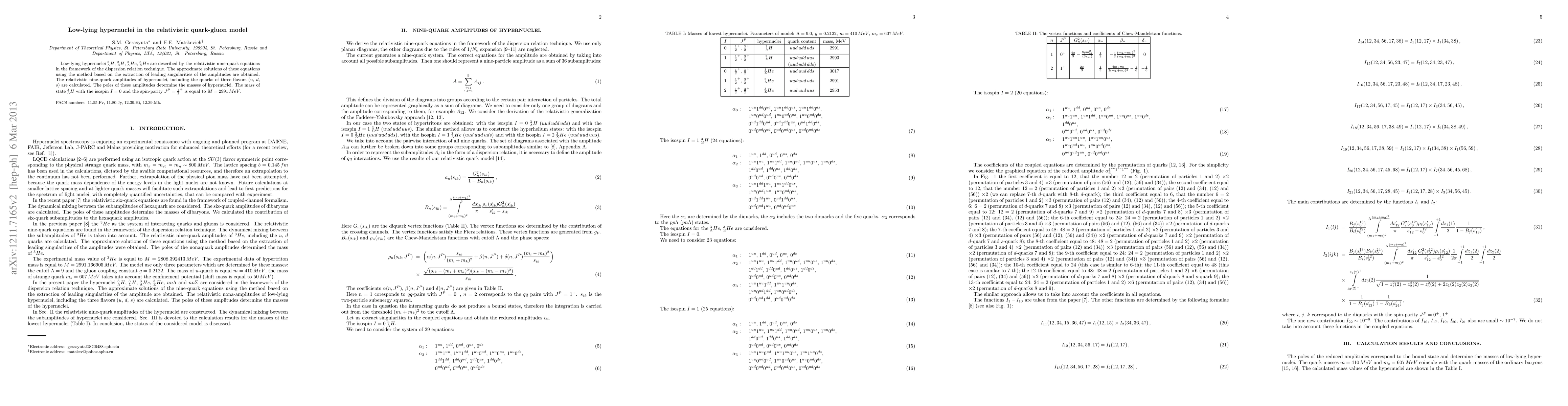 Low-lying hypernuclei $ ^3_{\Lambda}H$, $ ^3_{\Sigma}H$, $ ^3_{\Lambda}He$, $ ^3_{\Sigma}He$ are described by the relativistic nine-quark equations in the framework of the dispersion relation technique. The approximate solutions of these equations using the method based on the extraction of leading singularities of the amplitudes are obtained. The relativistic nine-quark amplitudes of hypernuclei, including the quarks of three flavors ($u$, $d$, $s$) are calculated. The poles of these amplitudes determine the masses of hypernuclei. The mass of state $ ^3_{\Lambda}H$ with the isospin I=0 and the spin-parity $J^P=\frac{1}{2}^+$ is equal to $M=2991\, MeV$.