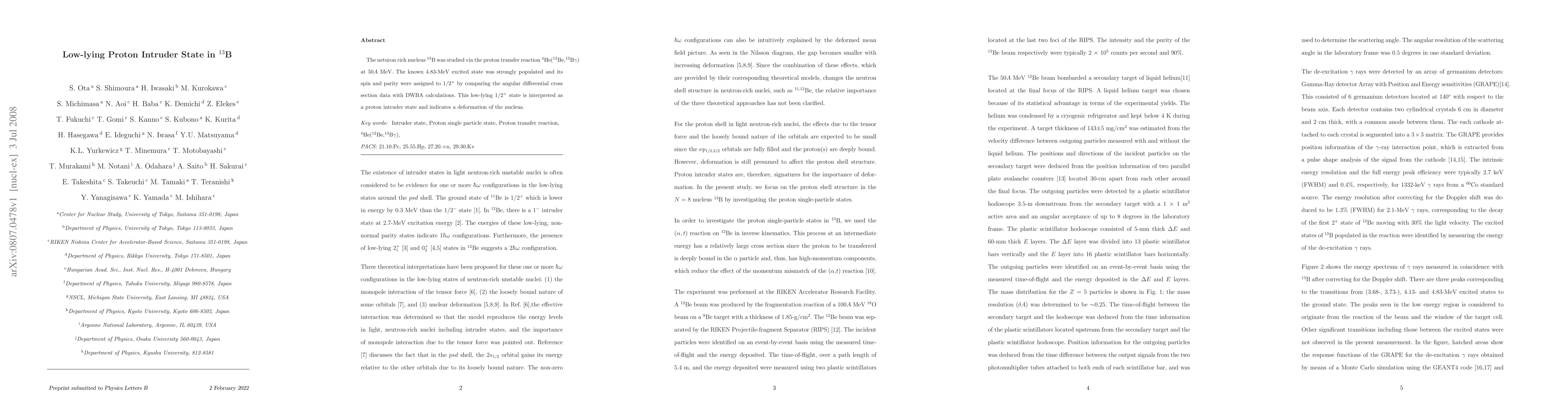 The neturon rich nucleus 13B was studied via the proton transfer reaction 4He(12Be,13B \gamma) at 50AMeV. The known 4.83-MeV excited state was strongly populated and its spin and parity were assigned to 1/2+ by comparing the angular differential cross section data with DWBA calculations. This low-lying 1/2+ state is interpreted as a proton intruder state and indicates a deformation of the nucleus.
