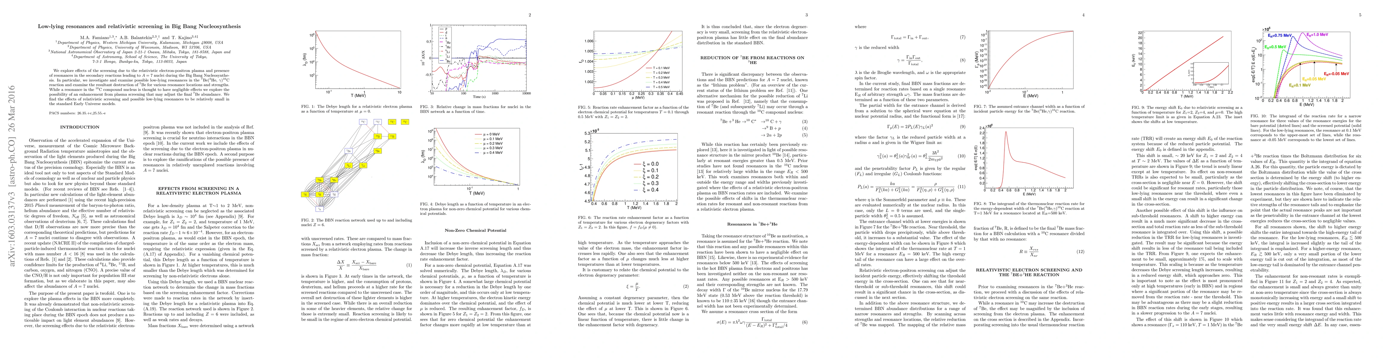We explore effects of the screening due to the relativistic electron-positron plasma and presence of resonances in the secondary reactions leading to A=7 nuclei during the Big Bang Nucleosynthesis. In particular, we investigate and examine possible low-lying resonances in the $^7$Be($^3$He, $\gamma$)$^{10}$C reaction and examine the resultant destruction of $^7$Be for various resonance locations and strengths. While a resonance in the $^{10}$C compound nucleus is thought to have negligible effects we explore the possibility of an enhancement from plasma screening that may adjust the final $^7$Be abundance. We find the effects of relativistic screening and possible low-lying resonances to be relatively small in the standard Early Universe models.
