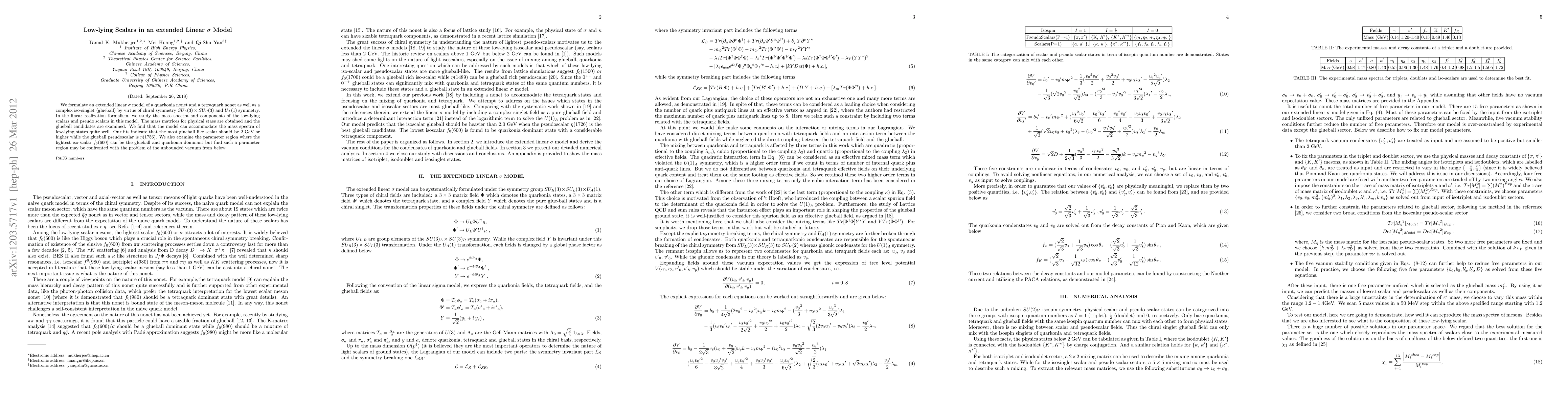 We formulate an extended linear $\sigma$ model of a quarkonia nonet and a tetraquark nonet as well as a complex iso-singlet (glueball) by virtue of chiral symmetry $SU_L(3) \times SU_R(3)$ and $U_A(1)$ symmetry. In the linear realization formalism, we study the mass spectra and components of the low-lying scalars and pseudo scalars in this model. The mass matrices for physical staes are obtained and the glueball candidates are examined. We find that the model can accommodate the mass spectra of low-lying states quite well. Our fits indicate that the most glueball like scalar should be 2 GeV or higher while the glueball pseudoscalar is $\eta(1756)$. We also examine the parameter region where the lightest iso-scalar $f_0(600)$ can be the glueball and quarkonia dominant but find such a parameter region may be confronted with the problem of the unbounded vacuum from below.