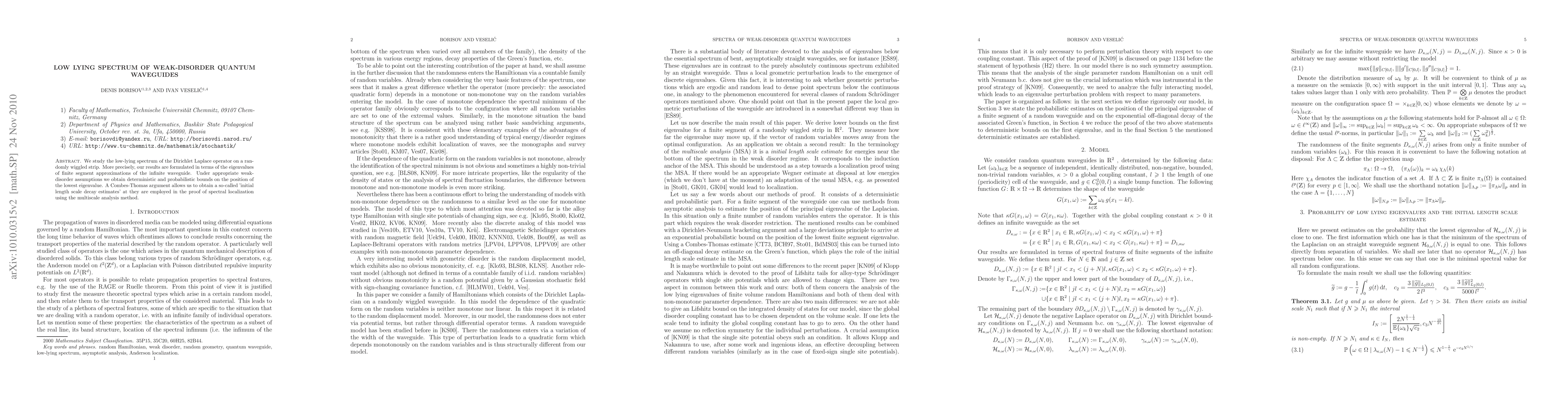 We study the low-lying spectrum of the Dirichlet Laplace operator on a randomly wiggled strip. More precisely, our results are formulated in terms of the eigenvalues of finite segment approximations of the infinite waveguide. Under appropriate weak-disorder assumptions we obtain deterministic and probabilistic bounds on the position of the lowest eigenvalue. A Combes-Thomas argument allows us to obtain so-called 'initial length scale decay estimates' at they are used in the proof of spectral localization using the multiscale analysis.