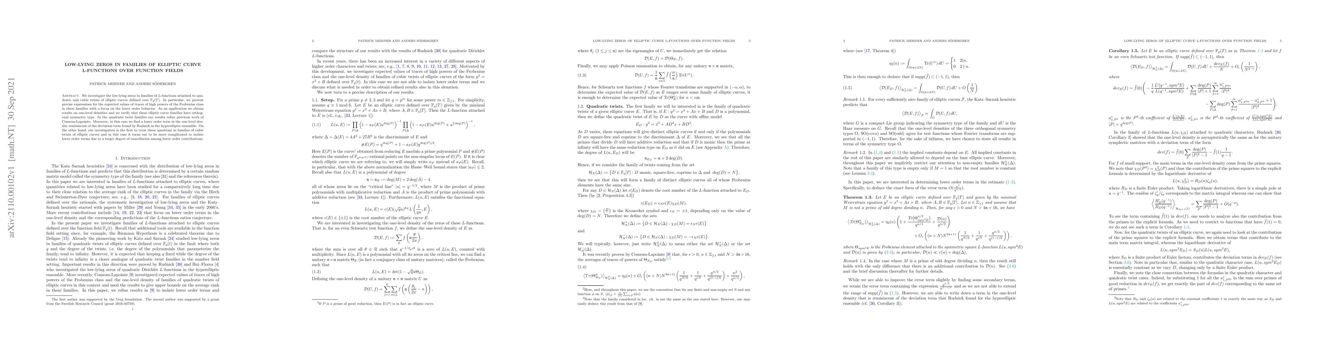 This paper studies low-lying zeros in $L$-functions associated with quadratic and cubic twists of elliptic curves over function fields, providing precise expressions for trace values and verifying orthogonal symmetry type. It refines previous results for quadratic twists and introduces new findings for cubic twists, highlighting complexities in isolating lower order terms.