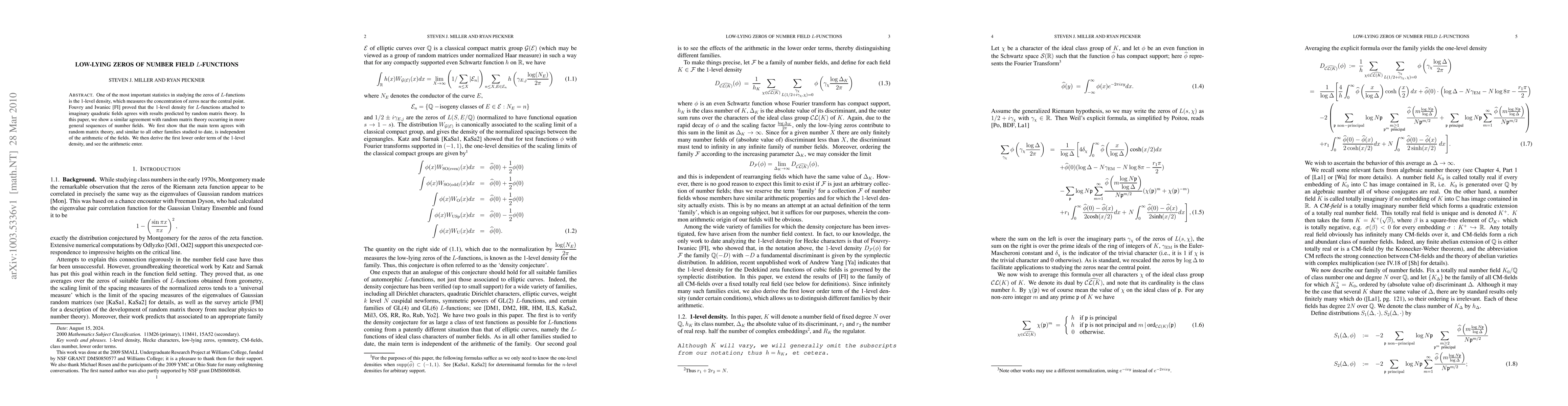 One of the most important statistics in studying the zeros of L-functions is the 1-level density, which measures the concentration of zeros near the central point. Fouvry and Iwaniec [FI] proved that the 1-level density for L-functions attached to imaginary quadratic fields agrees with results predicted by random matrix theory. In this paper, we show a similar agreement with random matrix theory occurring in more general sequences of number fields. We first show that the main term agrees with random matrix theory, and similar to all other families studied to date, is independent of the arithmetic of the fields. We then derive the first lower order term of the 1-level density, and see the arithmetic enter.