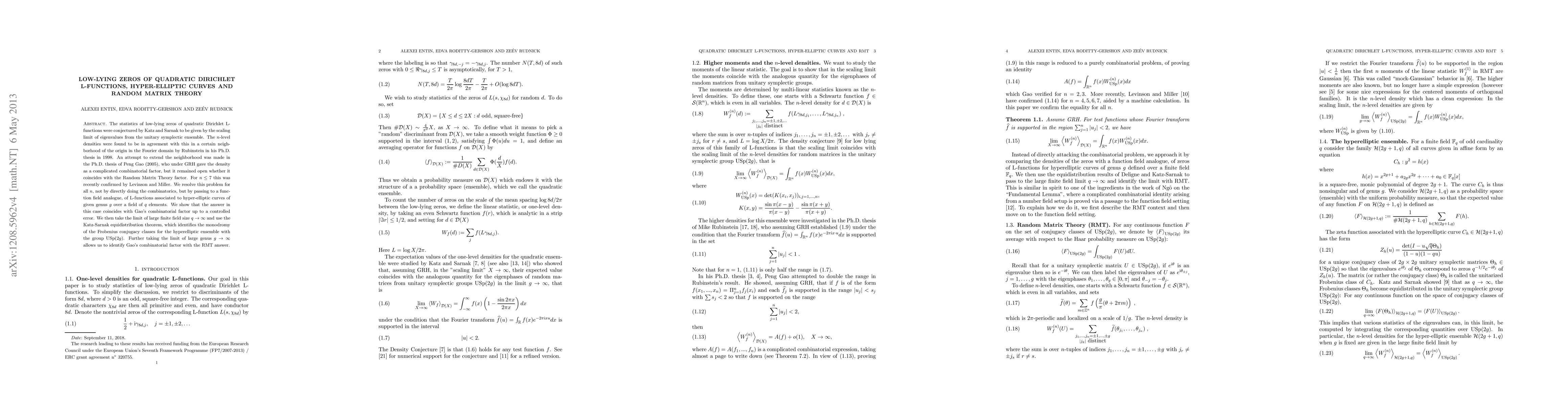 This paper resolves the conjecture regarding the statistics of low-lying zeros of quadratic Dirichlet L-functions by showing they match the Random Matrix Theory prediction. The authors use a function field analogue of L-functions associated with hyper-elliptic curves to bridge the combinatorial and RMT factors, ultimately confirming the conjecture for all n.