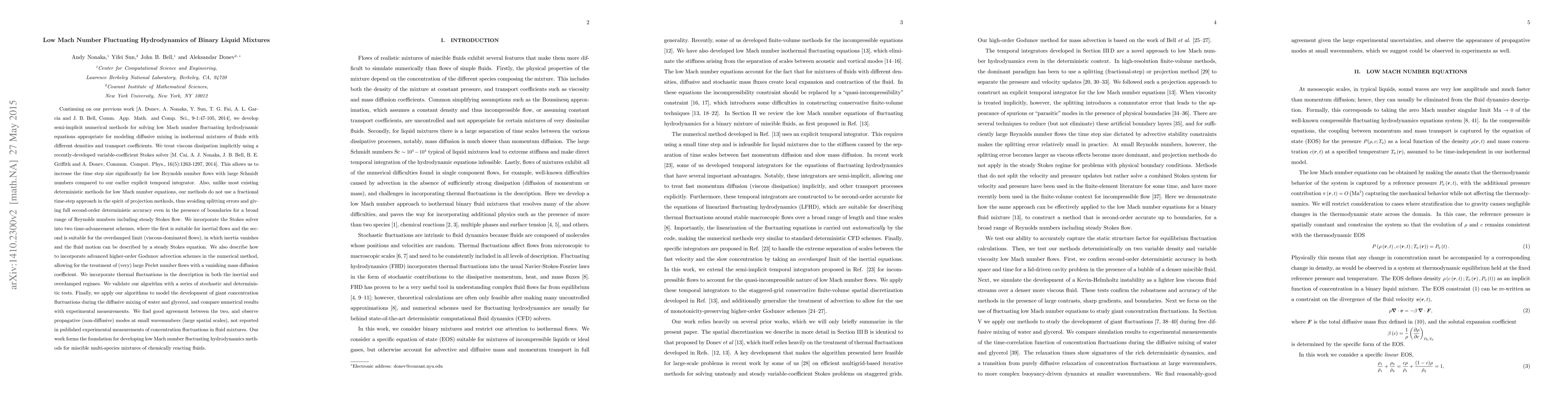 This paper develops advanced semi-implicit numerical methods for low Mach number fluctuating hydrodynamics to model diffusive mixing in binary liquid mixtures. The methods incorporate implicit treatment of viscous dissipation and higher-order advection schemes, allowing for accurate simulations of large-scale concentration fluctuations, including previously unreported propagative modes.