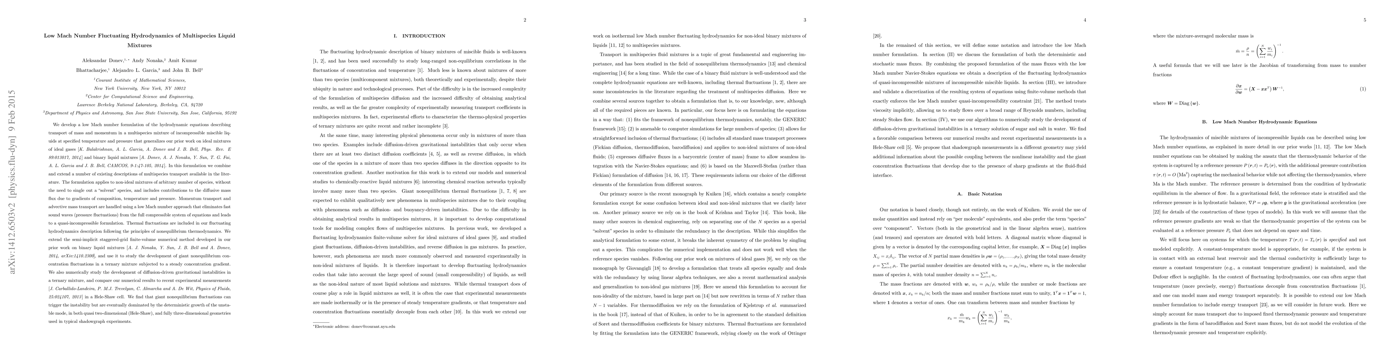 This paper presents a low Mach number hydrodynamic formulation for multispecies liquid mixtures, extending previous work to non-ideal mixtures without a designated solvent. It includes diffusive mass flux contributions from composition, temperature, and pressure gradients and employs a quasi-incompressible approach to eliminate fast sound waves. Numerical simulations reveal the role of giant nonequilibrium concentration fluctuations in triggering diffusion-driven gravitational instabilities.