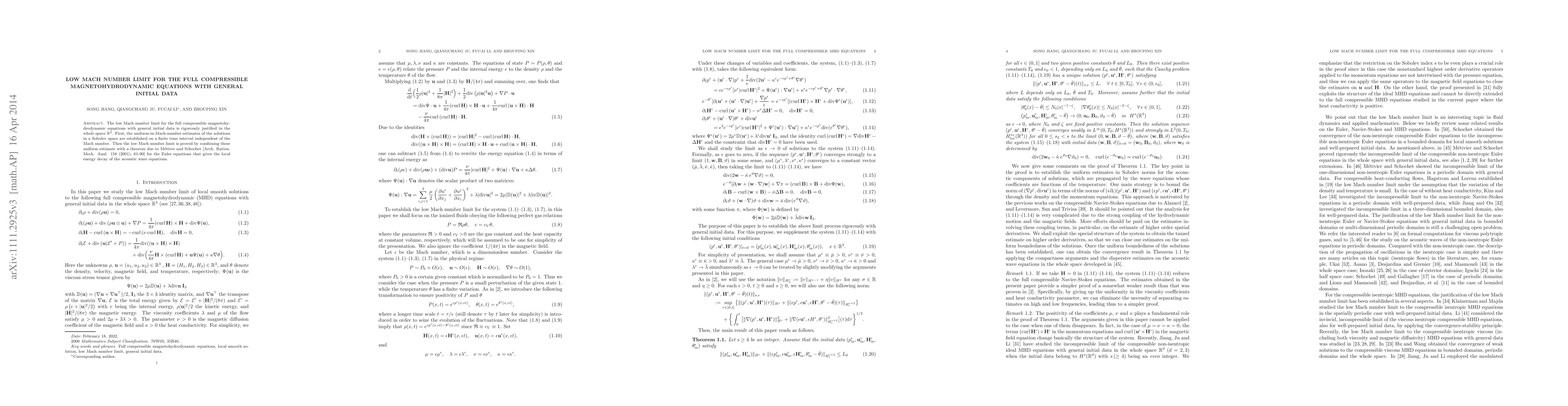 This paper rigorously justifies the low Mach number limit for full compressible magnetohydrodynamic equations with general initial data in $\mathbb{R}^3$, obtaining uniform in Mach number estimates independent of the Mach number. The proof leverages established uniform estimates and a theorem for local energy decay of acoustic wave equations.