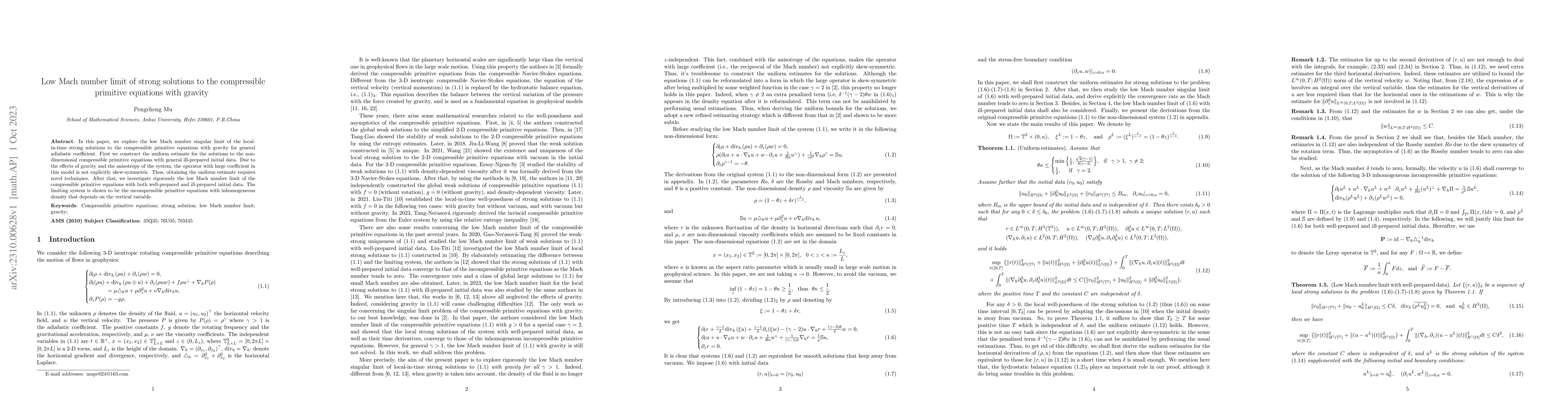 In this paper, we explore the low Mach number singular limit of the local-in-time strong solutions to the compressible primitive equations with gravity for general adiabatic coefficient. First we construct the uniform estimate for the solutions to the non-dimensional compressible primitive equations with general ill-prepared initial data. Due to the effects of gravity and the anisotropy of the system, the operator with large coefficient in this model is not explicitly skew-symmetric. Thus, obtaining the uniform estimate requires novel techniques. After that, we investigate rigorously the low Mach number limit of the compressible primitive equations with both well-prepared and ill-prepared initial data. The limiting system is shown to be the incompressible primitive equations with inhomogeneous density that depends on the vertical variable.