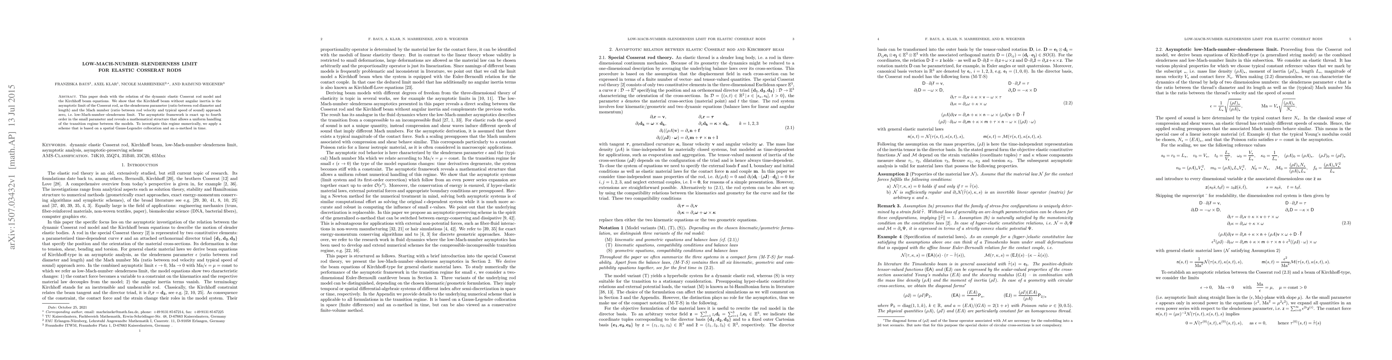 This paper deals with the relation of the dynamic elastic Cosserat rod model and the Kirchhoff beam equations. We show that the Kirchhoff beam without angular inertia is the asymptotic limit of the Cosserat rod, as the slenderness parameter (ratio between rod diameter and length) and the Mach number (ratio between rod velocity and typical speed of sound) approach zero, i.e. low-Mach-number--slenderness limit. The asymptotic framework is exact up to fourth order in the small parameter and reveals a mathematical structure that allows a uniform handling of the transition regime between the models. To investigate this regime numerically, we apply a scheme that is based on a spatial Gauss-Legendre collocation and an $\alpha$-method in time.