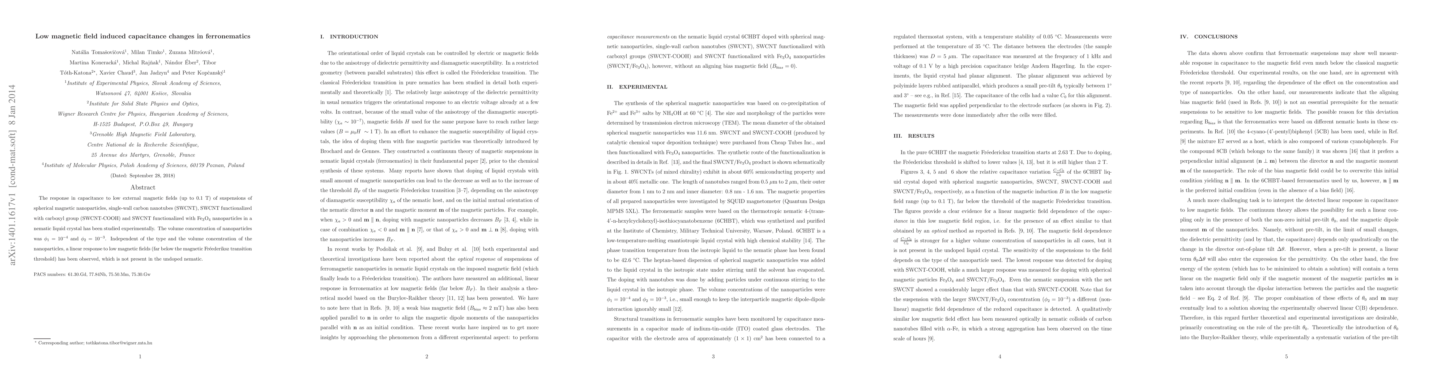 The study experimentally observed a linear capacitance response to low magnetic fields in nematic liquid crystals doped with various magnetic nanoparticles, including SWCNT and SWCNT-COOH, regardless of nanoparticle type or concentration. This effect was absent in the undoped nematic.