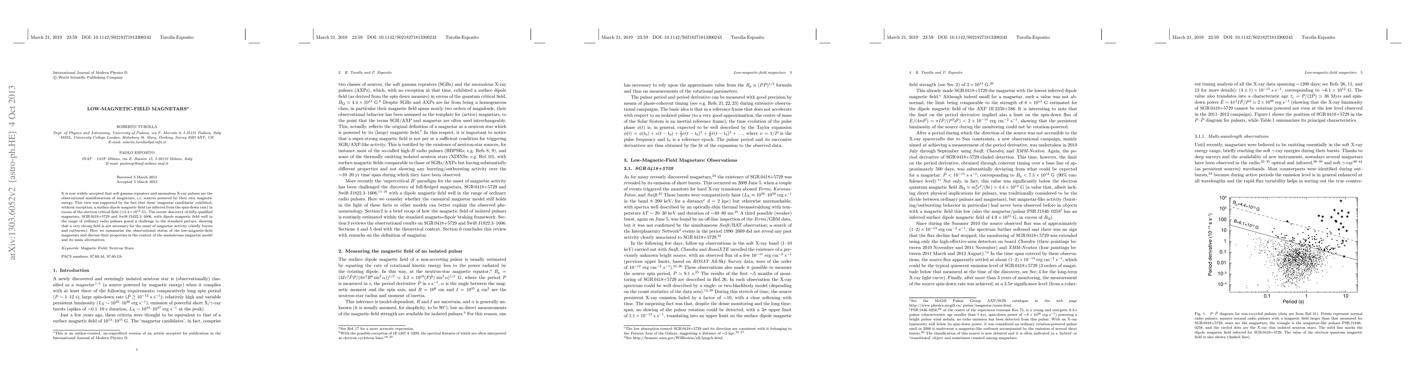 It is now widely accepted that soft gamma repeaters and anomalous X-ray pulsars are the observational manifestations of magnetars, i.e. sources powered by their own magnetic energy. This view was supported by the fact that these `magnetar candidates' exhibited, without exception, a surface dipole magnetic field (as inferred from the spin-down rate) in excess of the electron critical field (~4.4E+13 G). The recent discovery of fully-qualified magnetars, SGR 0418+5729 and Swift J1822.3-1606, with dipole magnetic field well in the range of ordinary radio pulsars posed a challenge to the standard picture, showing that a very strong field is not necessary for the onset of magnetar activity (chiefly bursts and outbursts). Here we summarize the observational status of the low-magnetic-field magnetars and discuss their properties in the context of the mainstream magnetar model and its main alternatives.