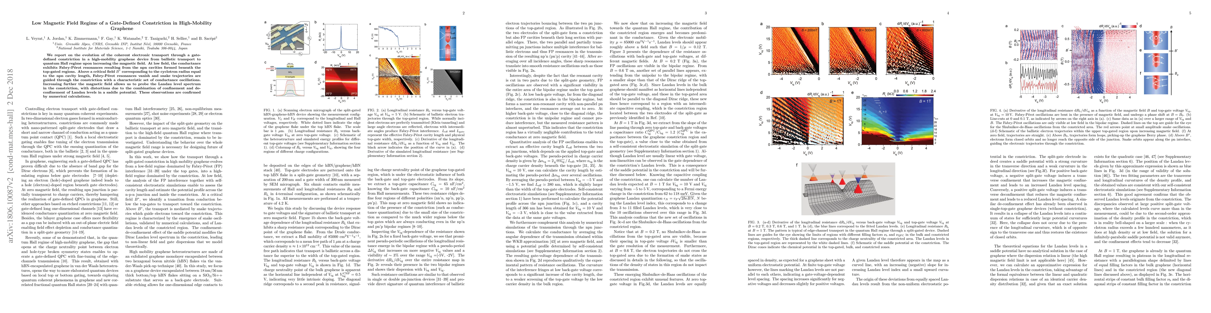 This paper investigates the electronic transport in a high-mobility graphene constriction under low magnetic fields, revealing Fabry-Pérot resonances and transitioning to snake trajectories and quantum Hall regime with higher fields. Numerical simulations corroborate the observed conductance oscillations and Landau level distortions.