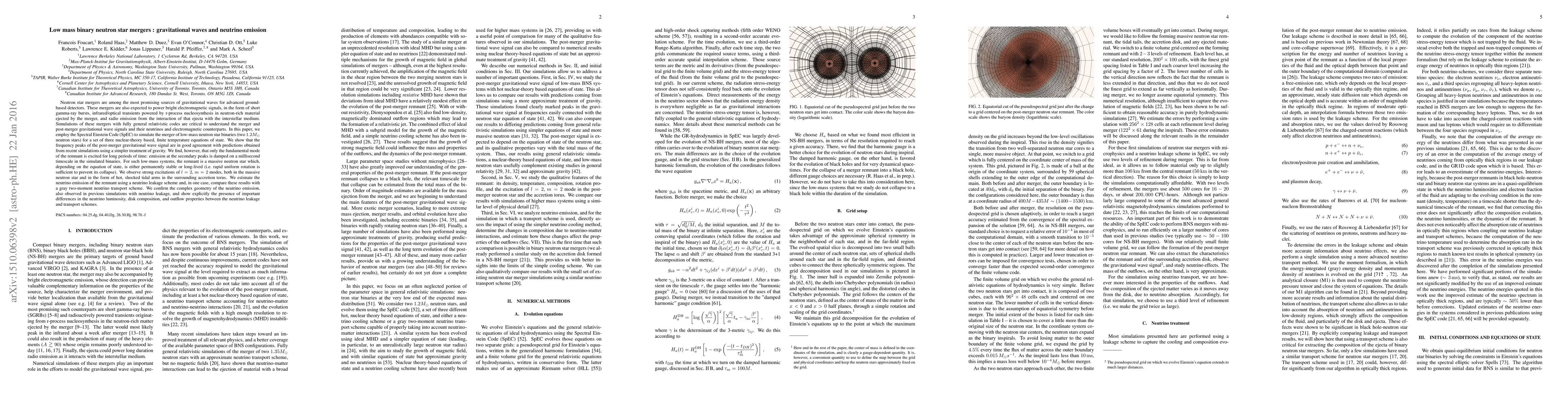 Neutron star mergers are among the most promising sources of gravitational waves for advanced ground-based detectors. These mergers are also expected to power bright electromagnetic signals, in the form of short gamma-ray bursts, infrared/optical transients, and radio emission. Simulations of these mergers with fully general relativistic codes are critical to understand the merger and post-merger gravitational wave signals and their neutrinos and electromagnetic counterparts. In this paper, we employ the SpEC code to simulate the merger of low-mass neutron star binaries (two $1.2M_\odot$ neutron stars) for a set of three nuclear-theory based, finite temperature equations of state. We show that the frequency peaks of the post-merger gravitational wave signal are in good agreement with predictions obtained from simulations using a simpler treatment of gravity. We find, however, that only the fundamental mode of the remnant is excited for long periods of time: emission at the secondary peaks is damped on a millisecond timescale in the simulated binaries. For such low-mass systems, the remnant is a massive neutron star which, depending on the equation of state, is either permanently stable or long-lived. We observe strong excitations of l=2, m=2 modes, both in the massive neutron star and in the form of hot, shocked tidal arms in the surrounding accretion torus. We estimate the neutrino emission of the remnant using a neutrino leakage scheme and, in one case, compare these results with a gray two-moment neutrino transport scheme. We confirm the complex geometry of the neutrino emission, also observed in previous simulations with neutrino leakage, and show explicitly the presence of important differences in the neutrino luminosity, disk composition, and outflow properties between the neutrino leakage and transport schemes.