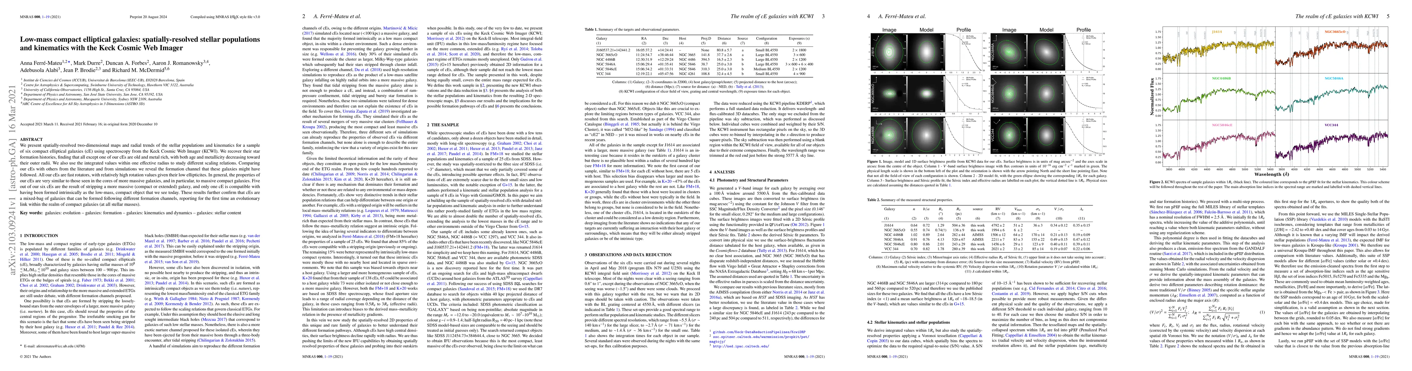 This study uses Keck Cosmic Web Imager spectroscopy to analyze the stellar populations and kinematics of six compact elliptical galaxies, revealing that most are old and metal-rich, with decreasing age and metallicity towards the outer regions. The galaxies exhibit high rotation values, suggesting formation via stripping of more massive galaxies, with only one likely formed intrinsically.