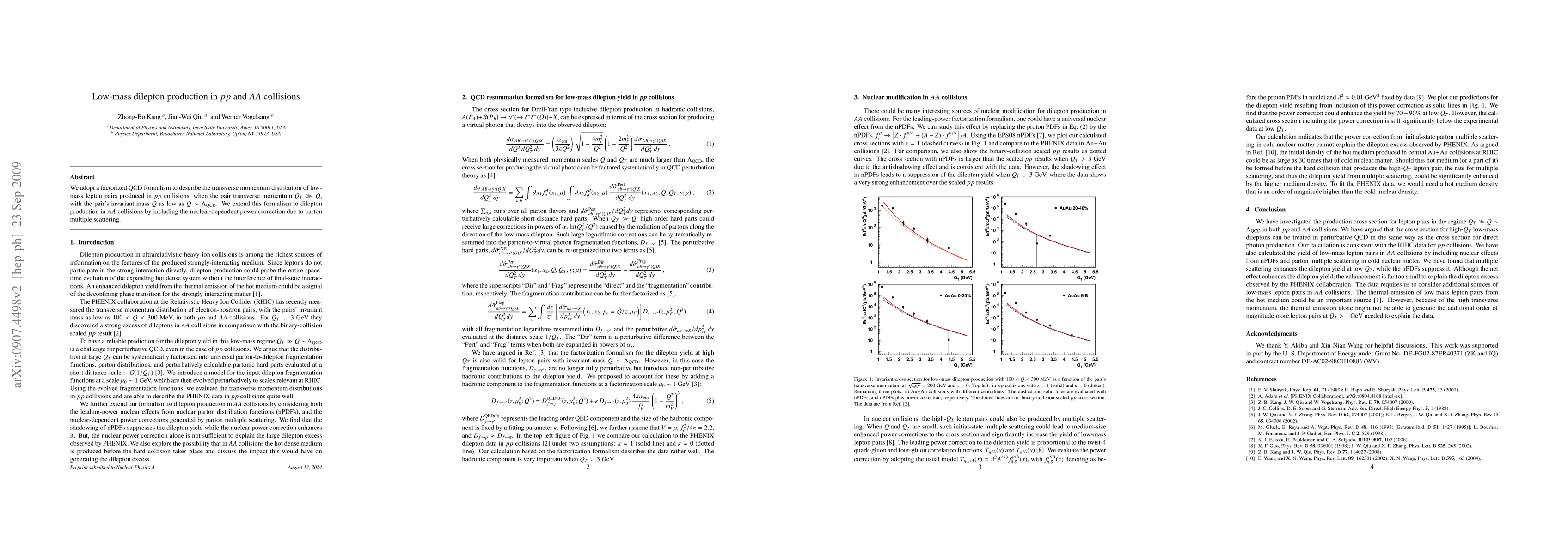 We adopt a factorized QCD formalism to describe the transverse momentum distribution of low-mass lepton pairs produced in $pp$ collisions, when the pair transverse momentum $Q_T \gg Q$, with the pair's invariant mass $Q$ as low as $Q \sim \Lambda_{\mathrm{QCD}}$. We extend this formalism to dilepton production in $AA$ collisions by including the nuclear-dependent power correction due to parton multiple scattering.