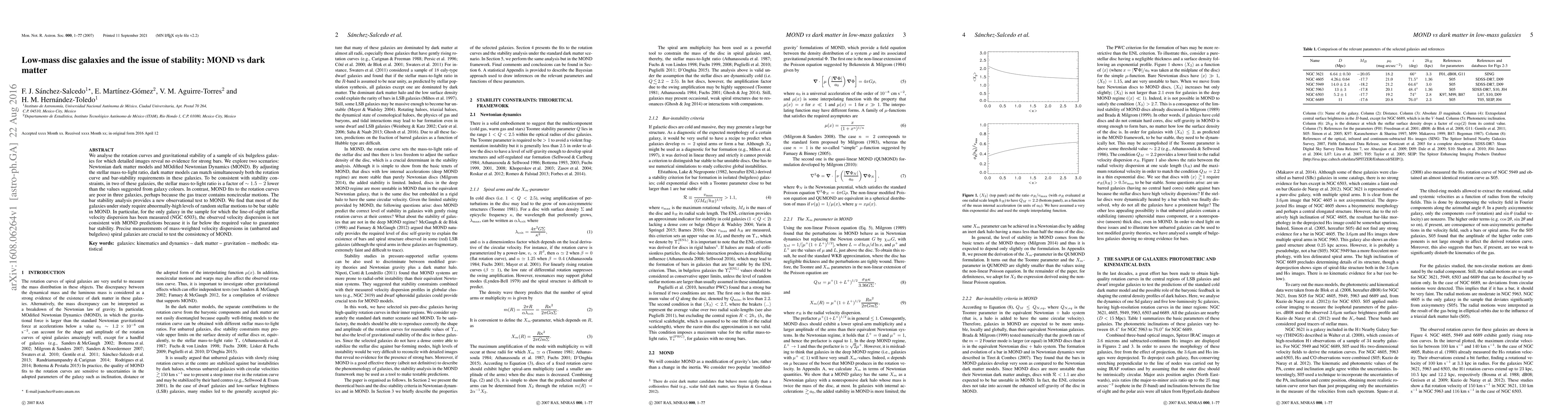 We analyse the rotation curves and gravitational stability of a sample of six bulgeless galaxies for which detailed images reveal no evidence for strong bars. We explore two scenarios: Newtonian dark matter models and MOdified Newtonian Dynamics (MOND). By adjusting the stellar mass-to-light ratio, dark matter models can match simultaneously both the rotation curve and bar-stability requirements in these galaxies. To be consistent with stability constraints, in two of these galaxies, the stellar mass-to-light ratio is a factor of ~1.5-2 lower than the values suggested from galaxy colours. In contrast, MOND fits to the rotation curves are poor in three galaxies, perhaps because the gas tracer contains noncircular motions. The bar stability analysis provides a new observational test to MOND. We find that most of the galaxies under study require abnormally-high levels of random stellar motions to be bar stable in MOND. In particular, for the only galaxy in the sample for which the line-of-sight stellar velocity dispersion has been measured (NGC 6503), the observed velocity dispersion is not consistent with MOND predictions because it is far below the required value to guarantee bar stability. Precise measurements of mass-weighted velocity dispersions in (unbarred and bulgeless) spiral galaxies are crucial to test the consistency of MOND.