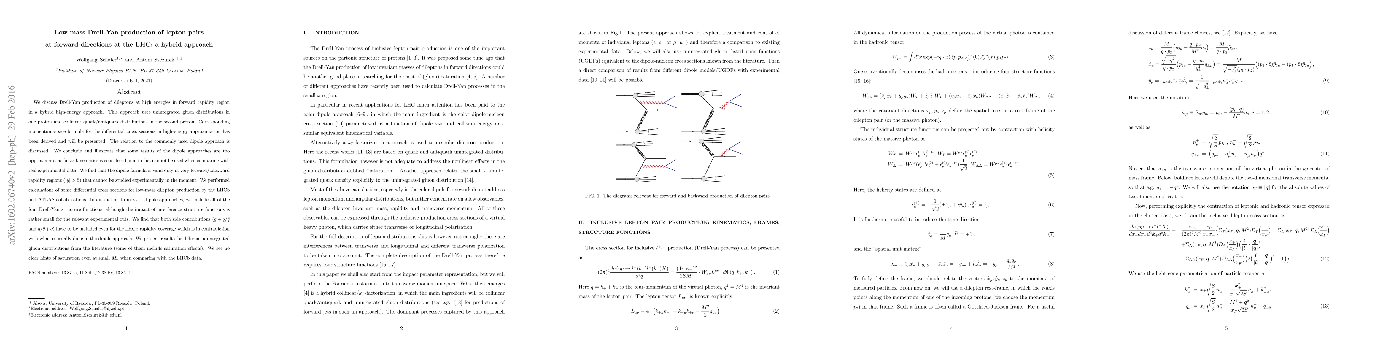 This paper presents a hybrid approach for Drell-Yan production of dileptons at high energies in the forward rapidity region, using unintegrated gluon distributions and collinear quark/antiquark distributions. It finds that the dipole approach is too approximate for experimental comparisons and valid only in very forward/backward regions, while the hybrid approach includes both gluon and quark contributions, showing no clear saturation effects at low masses.