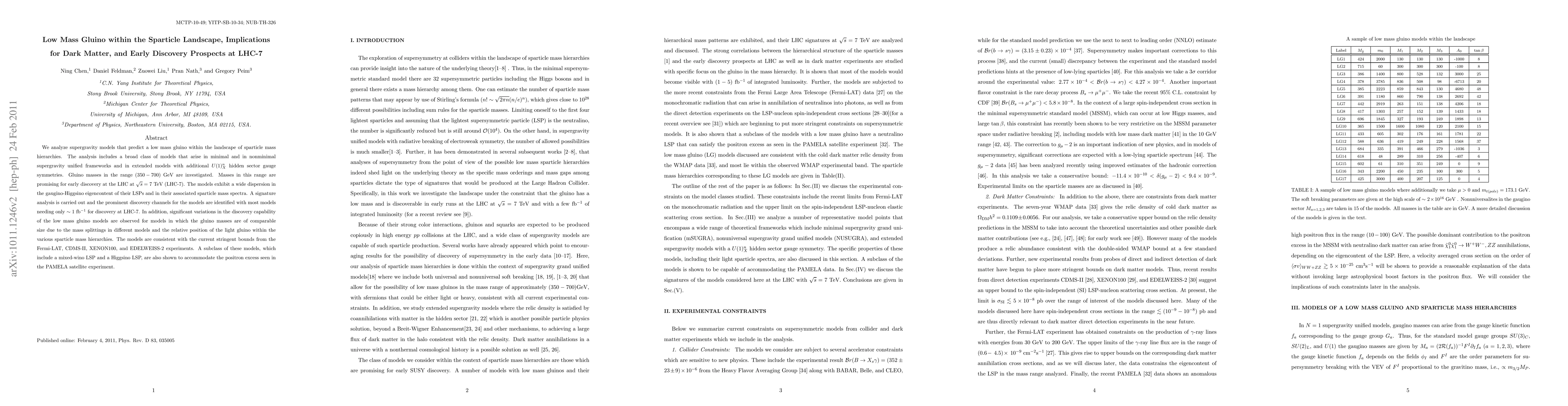 We analyze supergravity models that predict a low mass gluino within the landscape of sparticle mass hierarchies. The analysis includes a broad class of models that arise in minimal and in non-minimal supergravity unified frameworks and in extended models with additional $U(1)^n_X$ hidden sector gauge symmetries. Gluino masses in the range $(350-700)$ GeV are investigated. Masses in this range are promising for early discovery at the LHC at $\sqrt s =7$ TeV (LHC-7). The models exhibit a wide dispersion in the gaugino-Higgsino eigencontent of their LSPs and in their associated sparticle mass spectra. A signature analysis is carried out and the prominent discovery channels for the models are identified with most models needing only $\sim 1 \rm fb^{-1}$ for discovery at LHC-7. In addition, significant variations in the discovery capability of the low mass gluino models are observed for models in which the gluino masses are of comparable size due to the mass splittings in different models and the relative position of the light gluino within the various sparticle mass hierarchies. The models are consistent with the current stringent bounds from the Fermi-LAT, CDMS-II, XENON100, and EDELWEISS-2 experiments. A subclass of these models, which include a mixed-wino LSP and a Higgsino LSP, are also shown to accommodate the positron excess seen in the PAMELA satellite experiment.