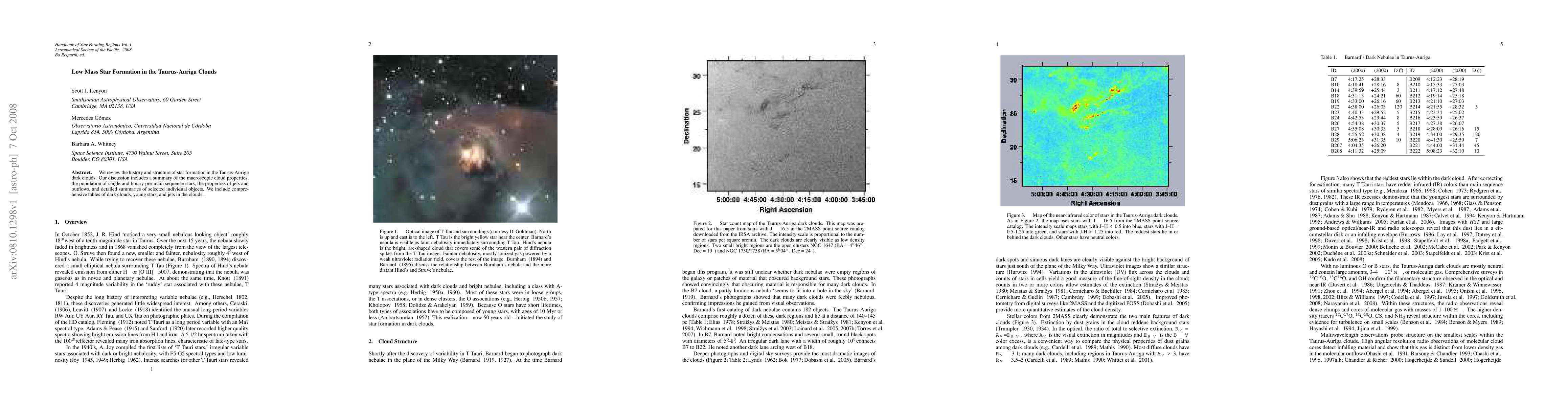 We review the history and structure of star formation in the Taurus-Auriga dark clouds. Our discussion includes a summary of the macroscopic cloud properties, the population of single and binary pre-main sequence stars, the properties of jets and outflows, and detailed summaries of selected individual objects. We include comprehensive tables of dark clouds, young stars, and jets in the clouds.