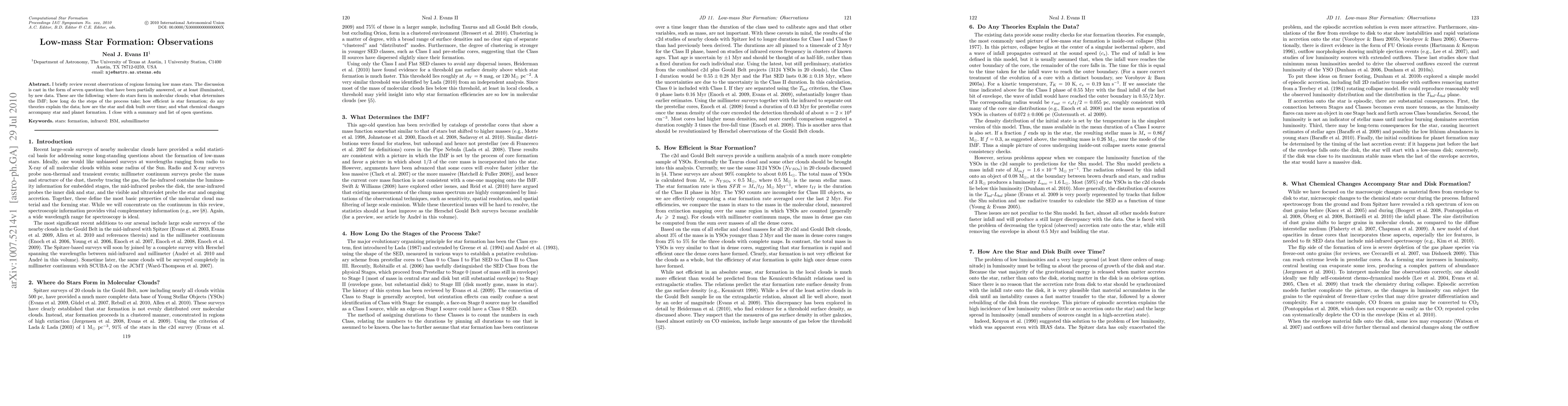 I briefly review recent observations of regions forming low mass stars. The discussion is cast in the form of seven questions that have been partially answered, or at least illuminated, by new data. These are the following: where do stars form in molecular clouds; what determines the IMF; how long do the steps of the process take; how efficient is star formation; do any theories explain the data; how are the star and disk built over time; and what chemical changes accompany star and planet formation. I close with a summary and list of open questions.