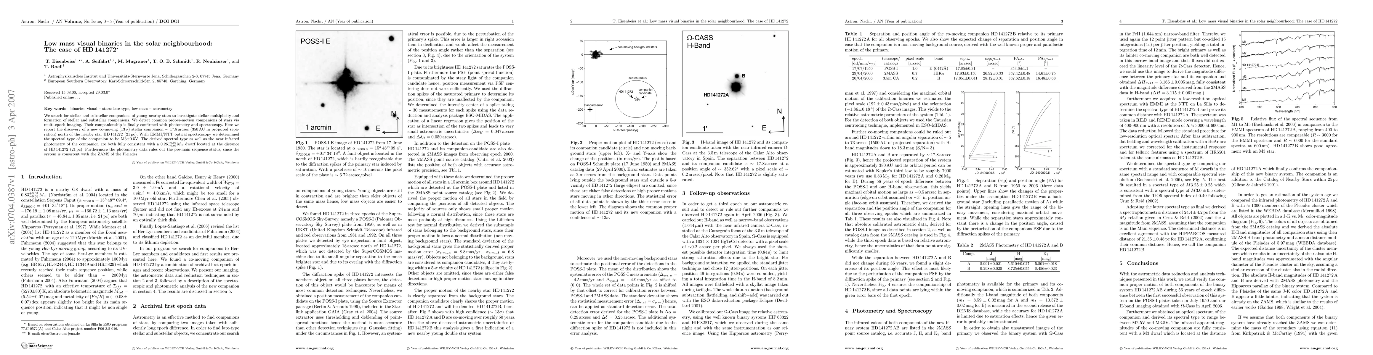We search for stellar and substellar companions of young nearby stars to investigate stellar multiplicity and formation of stellar and substellar companions. We detect common proper-motion companions of stars via multi-epoch imaging. Their companionship is finally confirmed with photometry and spectroscopy. Here we report the discovery of a new co-moving (13 sigma) stellar companion ~17.8 arcsec (350 AU in projected separation) north of the nearby star HD141272 (21 pc). With EMMI/NTT optical spectroscopy we determined the spectral type of the companion to be M3+-0.5V. The derived spectral type as well as the near infrared photometry of the companion are both fully consistent with a 0.26+-0.07 Msol dwarf located at the distance of HD141272 (21 pc). Furthermore the photometry data rules out the pre-main sequence status, since the system is consistent with the ZAMS of the Pleiades.