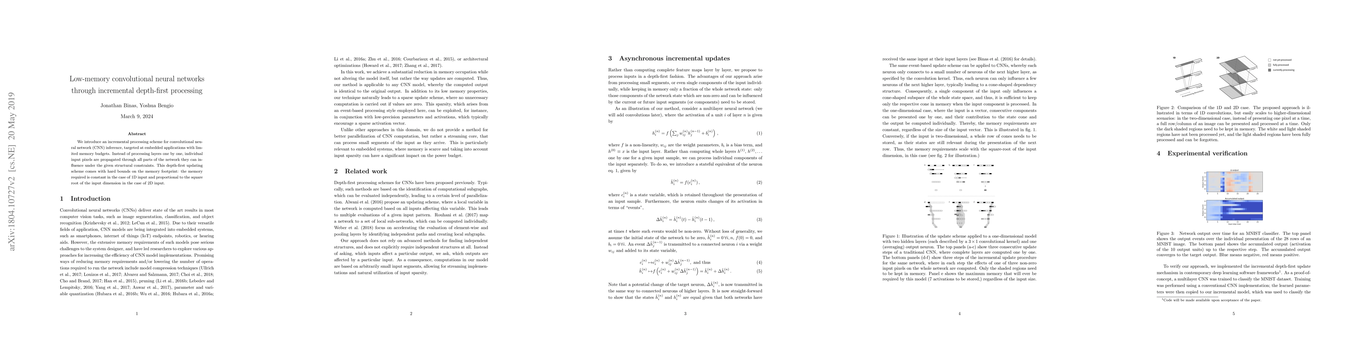 This paper proposes an incremental depth-first processing scheme for convolutional neural networks (CNNs) to optimize inference in memory-constrained embedded applications. This method processes individual input pixels through the network, ensuring constant or near-constant memory usage.