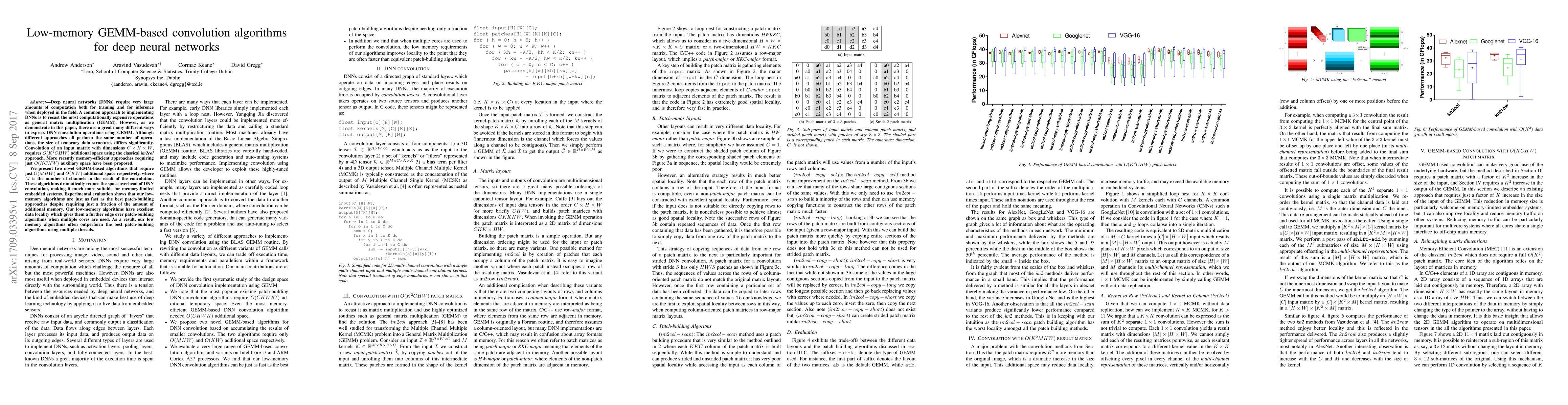 This paper presents two novel GEMM-based algorithms for DNN convolutions that require significantly less memory ($O(MHW)$ and $O(KW)$) compared to traditional methods ($O(K^2CHW)$). These low-memory algorithms maintain performance comparable to patch-building approaches, especially benefiting from better data locality when using multiple cores.