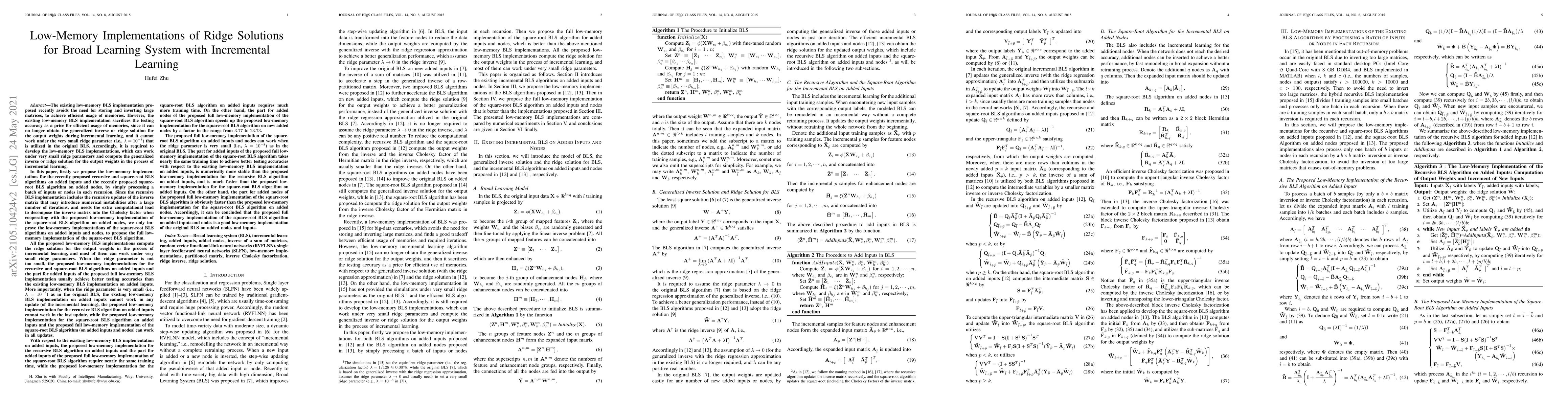 The existing low-memory BLS implementation proposed recently avoids the need for storing and inverting large matrices, to achieve efficient usage of memories. However, the existing low-memory BLS implementation sacrifices the testing accuracy as a price for efficient usage of memories, since it can no longer obtain the generalized inverse or ridge solution for the output weights during incremental learning, and it cannot work under the very small ridge parameter that is utilized in the original BLS. Accordingly, it is required to develop the low-memory BLS implementations, which can work under very small ridge parameters and compute the generalized inverse or ridge solution for the output weights in the process of incremental learning. In this paper, firstly we propose the low-memory implementations for the recently proposed recursive and square-root BLS algorithms on added inputs and the recently proposed squareroot BLS algorithm on added nodes, by simply processing a batch of inputs or nodes in each recursion. Since the recursive BLS implementation includes the recursive updates of the inverse matrix that may introduce numerical instabilities after a large number of iterations, and needs the extra computational load to decompose the inverse matrix into the Cholesky factor when cooperating with the proposed low-memory implementation of the square-root BLS algorithm on added nodes, we only improve the low-memory implementations of the square-root BLS algorithms on added inputs and nodes, to propose the full lowmemory implementation of the square-root BLS algorithm. All the proposed low-memory BLS implementations compute the ridge solution for the output weights in the process of incremental learning, and most of them can work under very small ridge parameters.