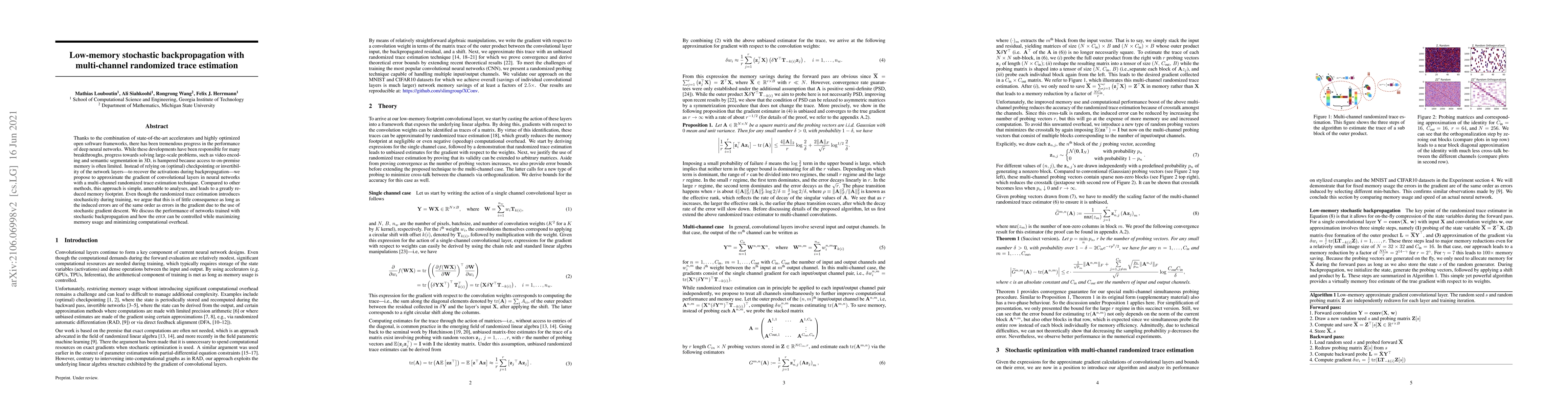 This paper proposes a low-memory stochastic backpropagation technique using multi-channel randomized trace estimation to approximate gradients in convolutional layers, significantly reducing memory usage without compromising performance. The method introduces controlled stochasticity that is argued to be negligible compared to inherent gradient errors from stochastic gradient descent.