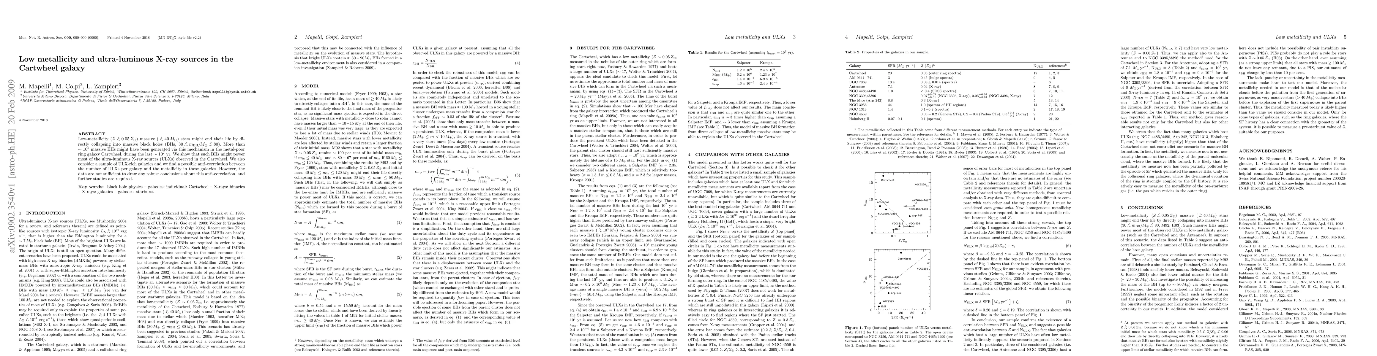 Low-metallicity (Z <~ 0.05 Zsun) massive (>~40 Msun) stars might end their life by directly collapsing into massive black holes (BHs, 30 <~ m_BH/Msun <~ 80). More than ~10^5 massive BHs might have been generated via this mechanism in the metal-poor ring galaxy Cartwheel, during the last ~10^7 yr. We show that such BHs might power most of the ultra-luminous X-ray sources (ULXs) observed in the Cartwheel. We also consider a sample of ULX-rich galaxies and we find a possible anti-correlation between the number of ULXs per galaxy and the metallicity in these galaxies. However, the data are not sufficient to draw any robust conclusions about this anti-correlation, and further studies are required.
