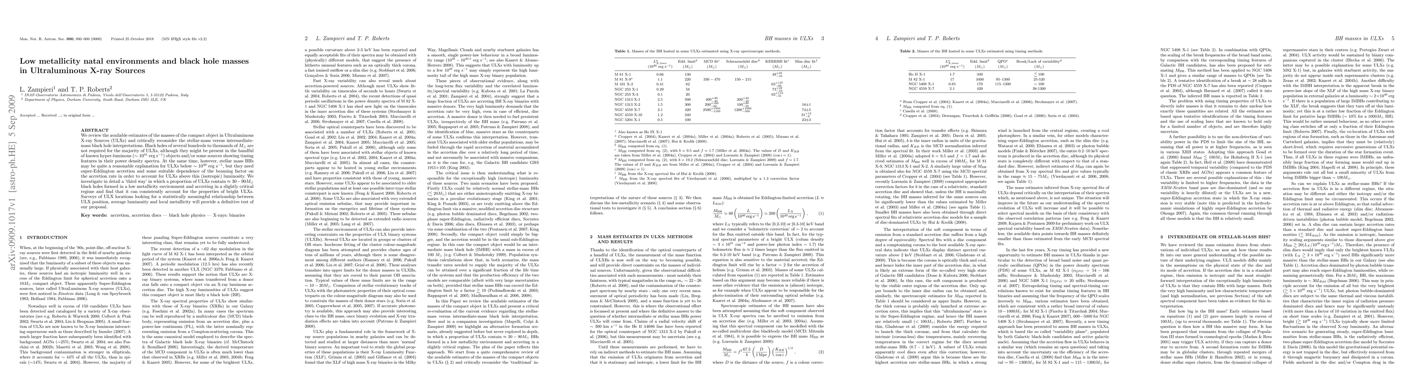 We review the available estimates of the masses of the compact object in Ultraluminous X-ray Sources (ULXs) and critically reconsider the stellar-mass versus intermediate-mass black hole interpretations. Black holes of several hundreds to thousands of $M_\odot$ are not required for the majority of ULXs, although they might be present in the handful of known hyper-luminous ($\sim 10^{41}$ erg s$^{-1}$) objects and/or some sources showing timing features in their power density spectra. At the same time, however, stellar mass BHs may be quite a reasonable explanation for ULXs below $\sim 10^{40}$ erg s$^{-1}$, but they need super-Eddington accretion and some suitable dependence of the beaming factor on the accretion rate in order to account for ULXs above this (isotropic) luminosity. We investigate in detail a 'third way' in which a proportion of ULXs contain $\approx 30-90 M_\odot$ black holes formed in a low metallicity environment and accreting in a slightly critical regime and find that it can consistently account for the properties of bright ULXs. Surveys of ULX locations looking for a statistically meaningful relationship between ULX position, average luminosity and local metallicity will provide a definitive test of our proposal.