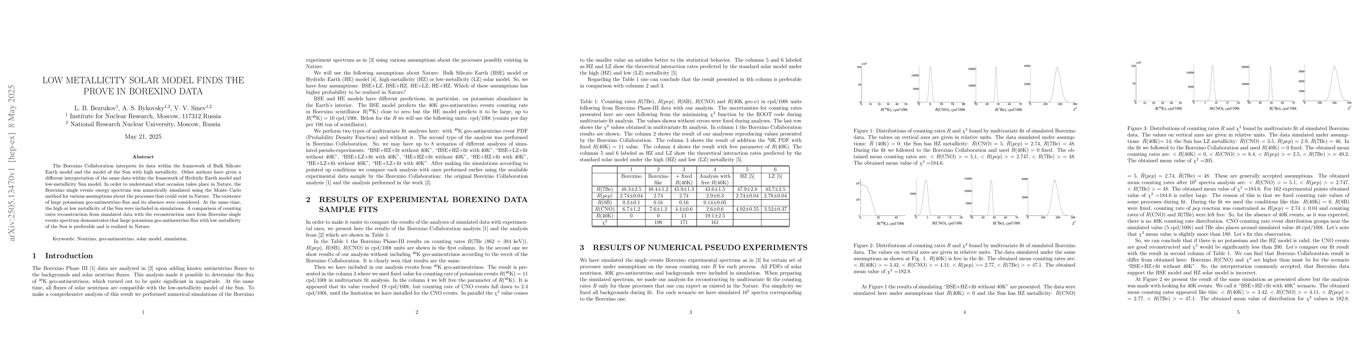 A study using Borexino data suggests that a low-metallicity Sun model is more likely to explain the observed energy spectrum of single events, which implies the existence of large potassium geo-antineutrino flux.