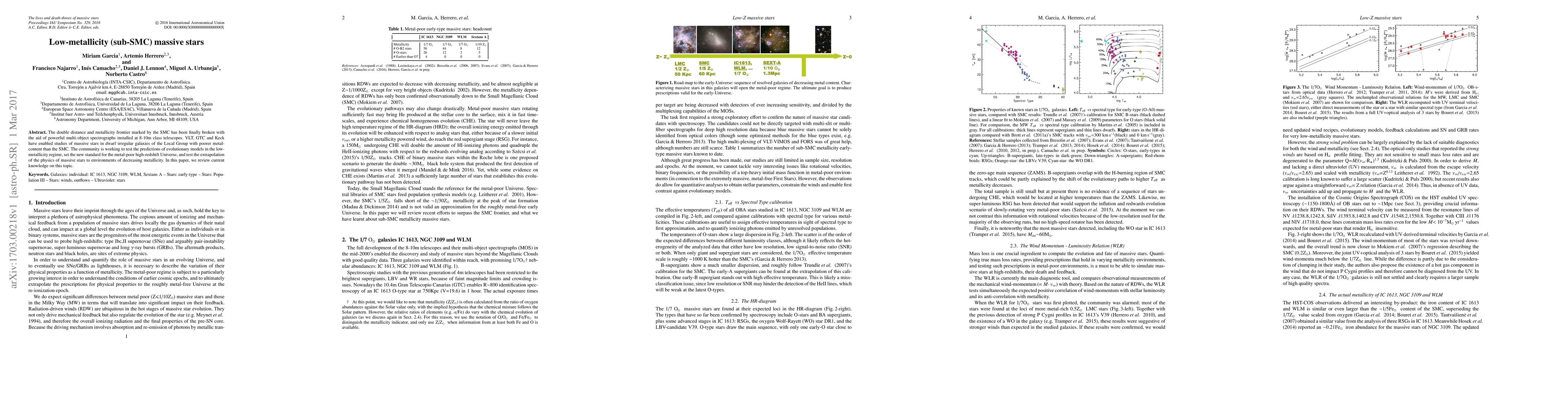 The double distance and metallicity frontier marked by the SMC has been finally broken with the aid of powerful multi-object spectrographs installed at 8-10m class telescopes. VLT, GTC and Keck have enabled studies of massive stars in dwarf irregular galaxies of the Local Group with poorer metal content than the SMC. The community is working to test the predictions of evolutionary models in the low-metallicity regime, set the new standard for the metal-poor high-redshift Universe, and test the extrapolation of the physics of massive stars to environments of decreasing metallicity. In this paper, we review current knowledge on this topic.