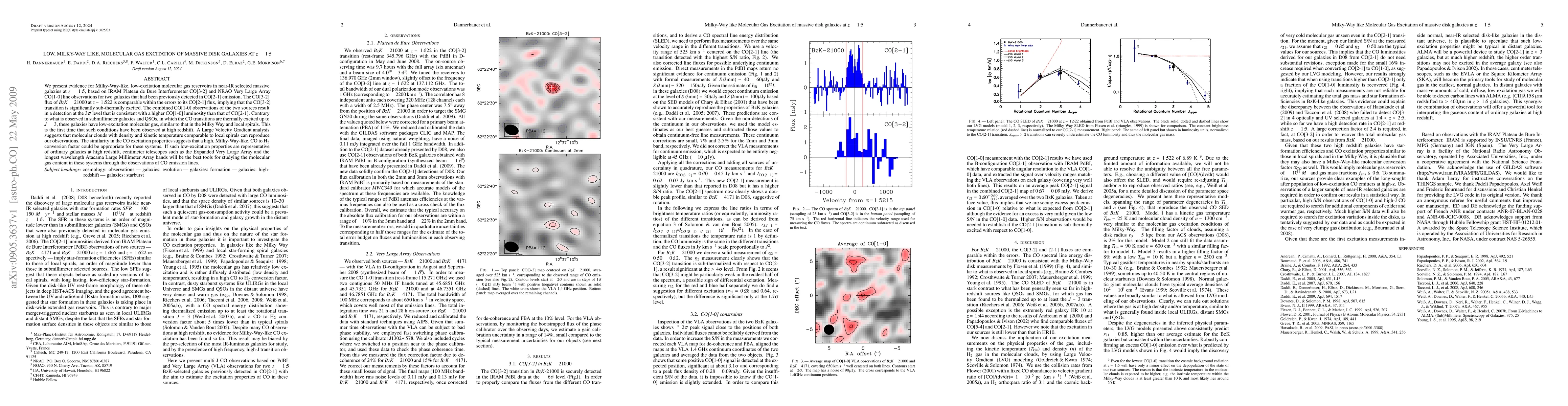 This paper presents evidence for Milky-Way-like, low-excitation molecular gas in massive disk galaxies at z~1.5, based on CO line observations. The findings suggest that these galaxies have molecular gas similar to that in local spirals, indicating a high CO to H_2 conversion factor.