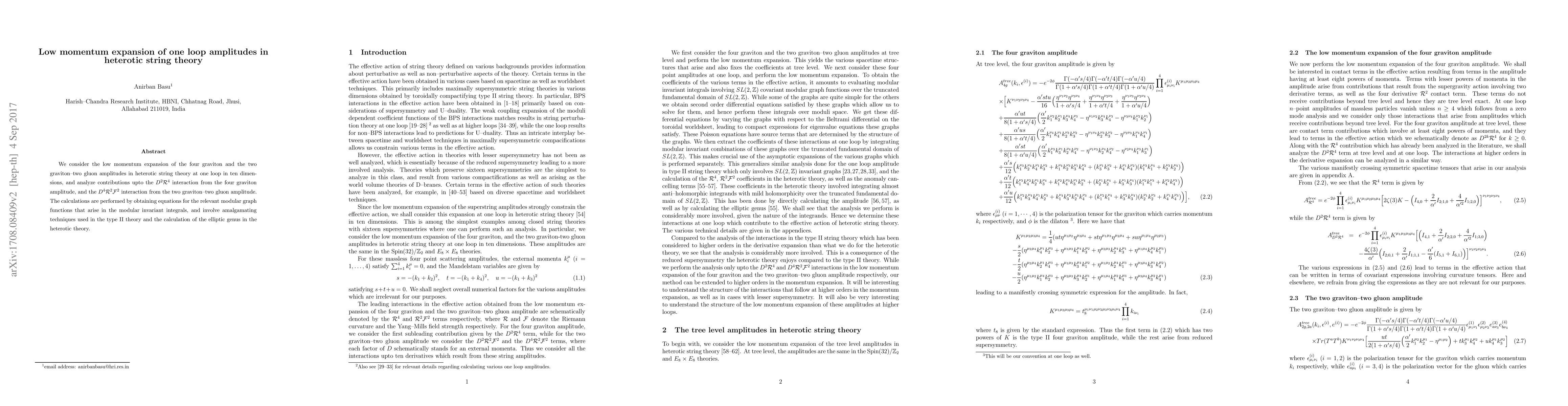 This paper investigates the low momentum expansion of one-loop amplitudes in heterotic string theory, focusing on four graviton and two graviton-two gluon interactions. It analyzes specific higher-order interactions, employing modular graph functions and techniques from type II theory and the elliptic genus calculation.