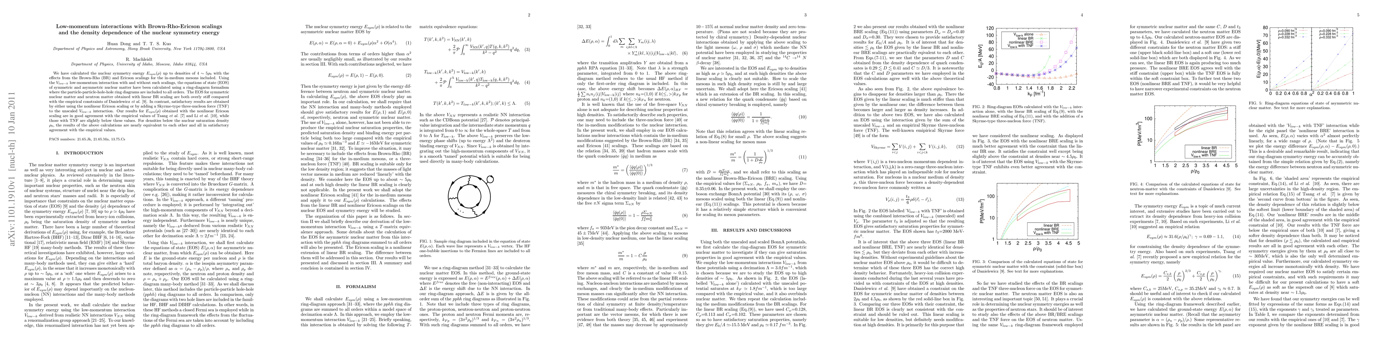 This paper investigates the nuclear symmetry energy $E_{sym}(\rho)$ up to densities of $4 \sim 5 \rho_0$ using low-momentum interactions with Brown-Rho and Ericson scalings. The study finds that nonlinear Ericson scaling or a Skyrme-type three-nucleon force provides better agreement with empirical constraints compared to linear Brown-Rho scaling.