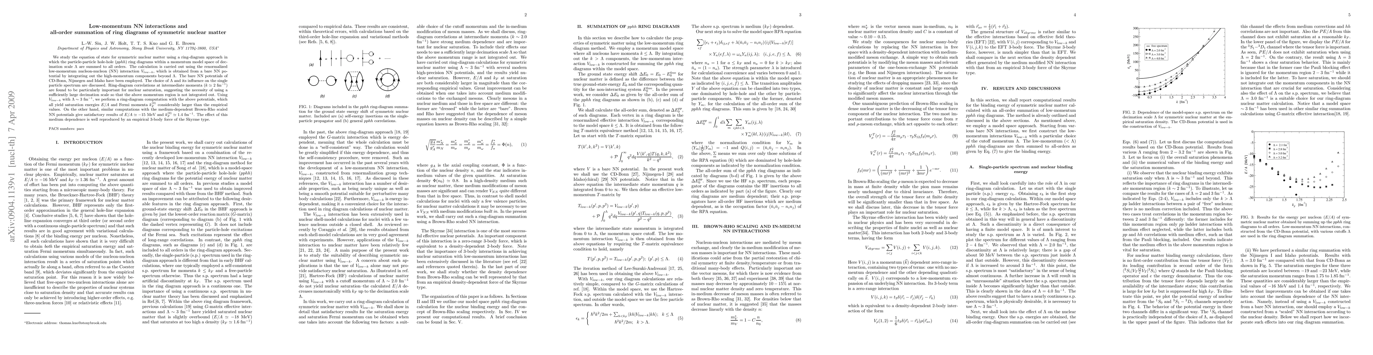 We study the equation of state for symmetric nuclear matter using a ring-diagram approach in which the particle-particle hole-hole ($pphh$) ring diagrams within a momentum model space of decimation scale $\Lambda$ are summed to all orders. The calculation is carried out using the renormalized low-momentum nucleon-nucleon (NN) interaction $V_{low-k}$, which is obtained from a bare NN potential by integrating out the high-momentum components beyond $\Lambda$. The bare NN potentials of CD-Bonn, Nijmegen and Idaho have been employed. The choice of $\Lambda$ and its influence on the single particle spectrum are discussed. Ring-diagram correlations at intermediate momenta ($k\simeq$ 2 fm$^{-1}$) are found to be particularly important for nuclear saturation, suggesting the necessity of using a sufficiently large decimation scale so that the above momentum region is not integrated out. Using $V_{low-k}$ with $\Lambda \sim 3$ fm$^{-1}$, we perform a ring-diagram computation with the above potentials, which all yield saturation energies $E/A$ and Fermi momenta $k_F^{(0)}$ considerably larger than the empirical values. On the other hand, similar computations with the medium-dependent Brown-Rho scaled NN potentials give satisfactory results of $E/A \simeq -15$ MeV and $k_F^{(0)}\simeq 1.4$ fm$^{-1}$. The effect of this medium dependence is well reproduced by an empirical 3-body force of the Skyrme type.
