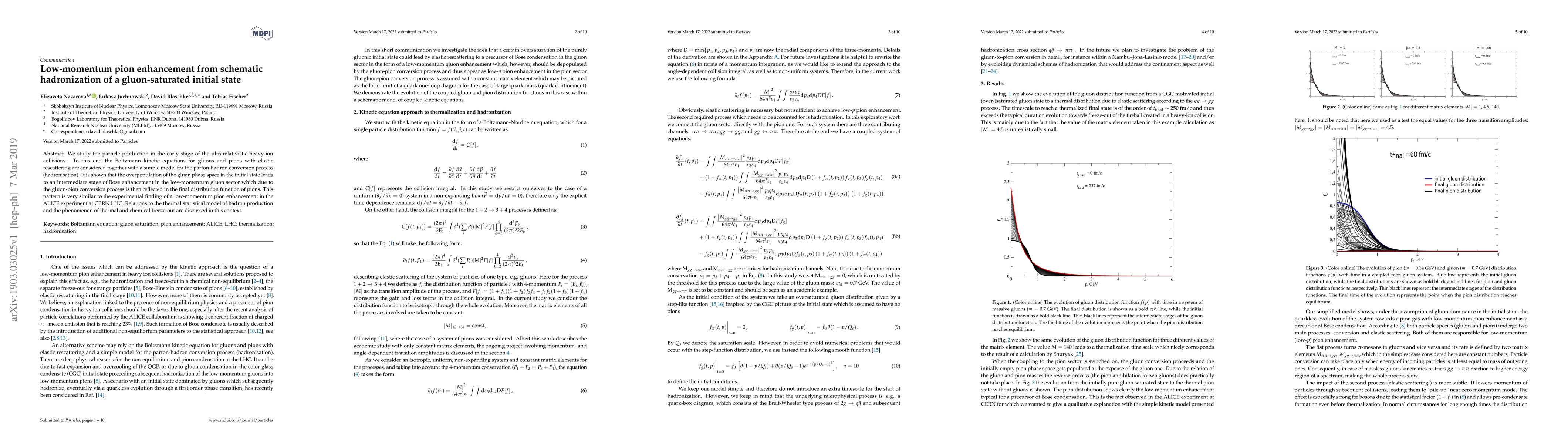 This study explores particle production in heavy-ion collisions, demonstrating that an overpopulation of gluons in the initial state results in low-momentum pion enhancement. This is achieved via Boltzmann kinetic equations for gluons and pions, along with a simple hadronization model, mirroring experimental findings from the ALICE experiment at CERN LHC. Implications for thermal statistical models and freeze-out phenomena are discussed.