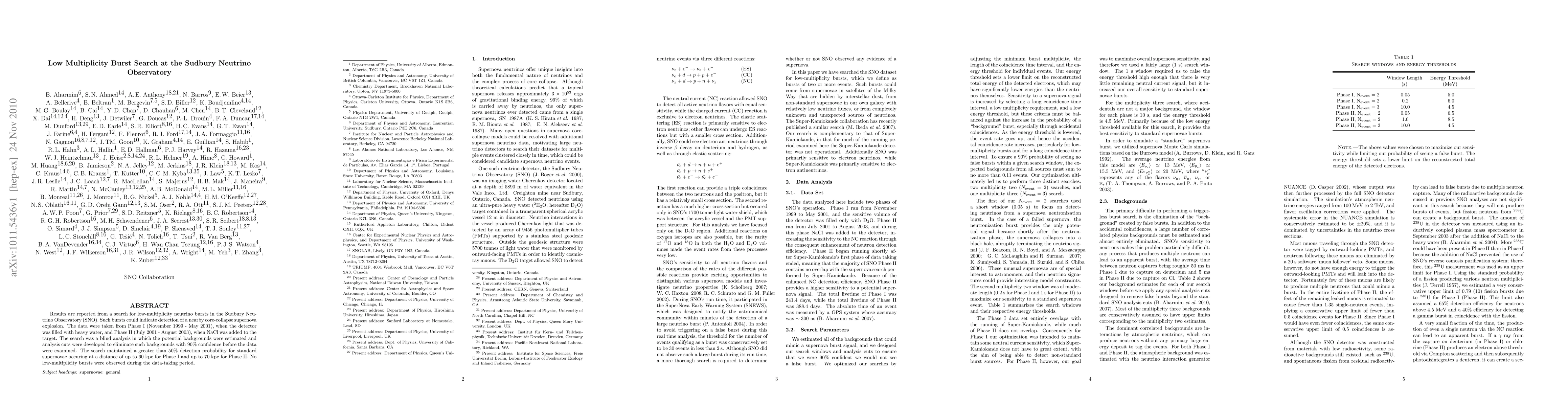 Results are reported from a search for low-multiplicity neutrino bursts in the Sudbury Neutrino Observatory (SNO). Such bursts could indicate detection of a nearby core-collapse supernova explosion. The data were taken from Phase I (November 1999 - May 2001), when the detector was filled with heavy water, and Phase II (July 2001 - August 2003), when NaCl was added to the target. The search was a blind analysis in which the potential backgrounds were estimated and analysis cuts were developed to eliminate such backgrounds with 90% confidence before the data were examined. The search maintained a greater than 50% detection probability for standard supernovae occurring at a distance of up to 60 kpc for Phase I and up to 70 kpc for Phase II. No low-multiplicity bursts were observed during the data-taking period.